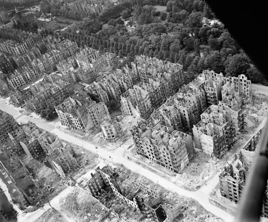 A photograph of burnt-out residential buildings in Hamburg following the firestorm created by the RAF bombing campaign Operation Gomorrah of July 1943. (Imperial War Museums Collection)