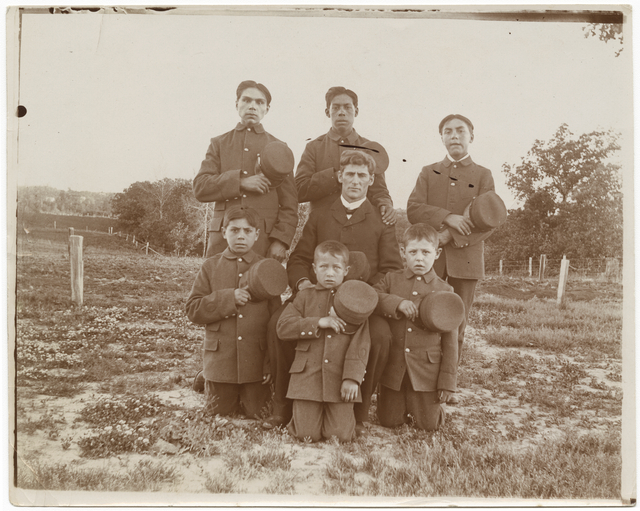 Teacher and young boys posed for photograph at an unknown American Indian boarding school, c. 1900.