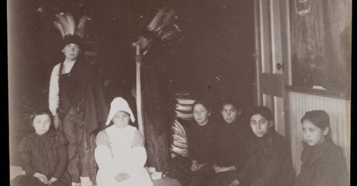 Thanksgiving Day play at an unknown Native American boarding school, c. 1900.