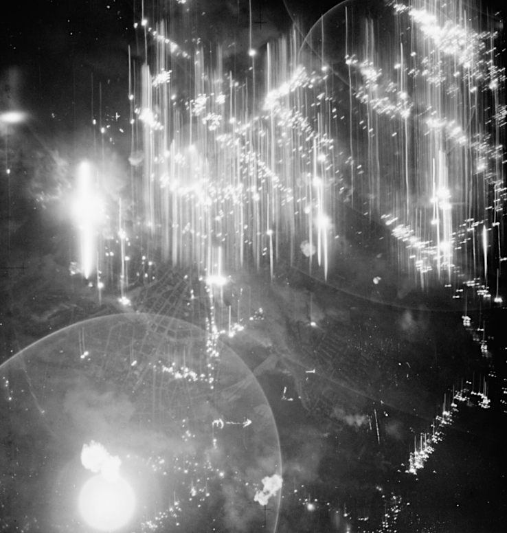 A shower of target indicators (TIs) dropped during the RAF bombing raids of the German city of Hamburg in July-August 1943. The raid caused a firestorm which killed over 44,000 civilians. (Imperial War Museums Collection)