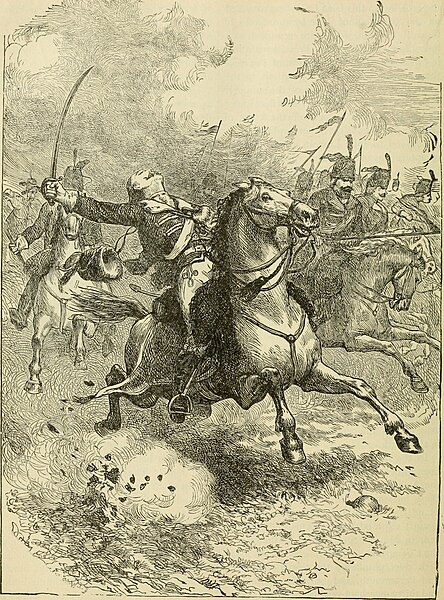 Casimir Pulaski is mortally wounded while leading the American cavalry on 9 October 1779 at the Siege of Savannah. Illustration from page 442 of Our greater country; being a standard history of the United States from the discovery of the American continent to the present time .. by Henry Davenport Northrop, Philadelphia, National pub co., 1901.