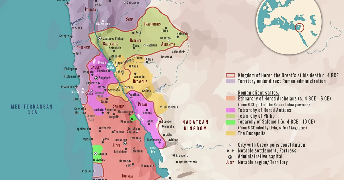This map illustrates the geopolitical situation in the Levant after the death of Herod the Great (ruled 37–4 BCE), the ambitious client king of Judea appointed by the Roman Senate. His death marked the breakup of his kingdom into the Herodian Tetrarchy, a division intended to preserve stability while ensuring loyalty to Rome. The arrangement created four smaller political units ruled by Herod’s sons and relatives, reflecting both dynastic continuity and increasing Roman oversight in the region.