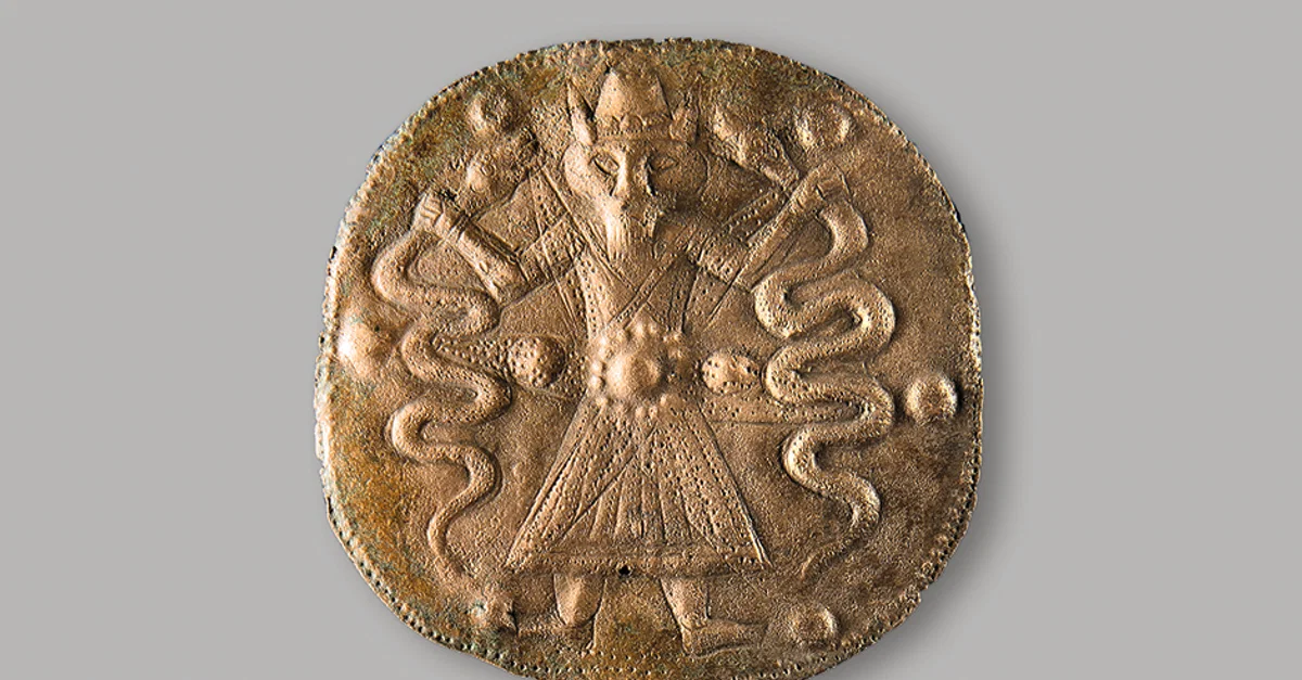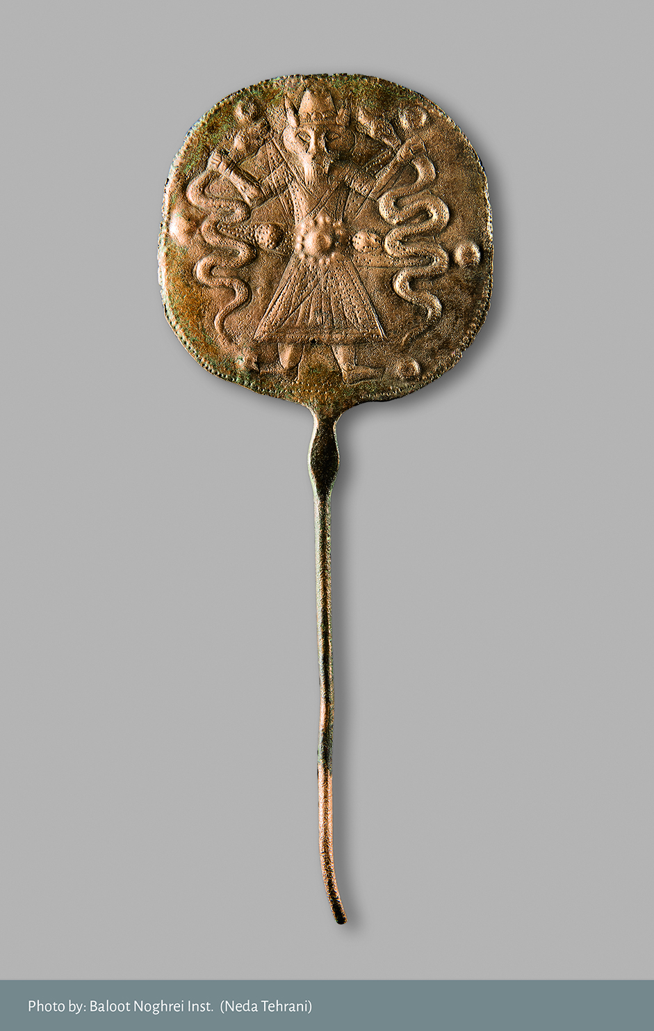 Long bronze hairpins crowned with a large disk are among the remarkable artefacts retrieved from Luristan, western Iran. Perhaps to serve a unisex function, or even made in two kinds for men and women, metal pins were used to fasten long curls, particularly of the nobility. The disks could bear decorations of geometric or representative content, such as the snake-clutching character above that may remind us of Hercules. However, a human figure, most likely a deity, sided by a pair of conquered beasts appears in the art of many ancient cultures from Egypt to the Near East and the Aegean. Known as the 'Master of Animals', the beast-fighting and monster-ruling male figure, sometimes with bovine features, such as horns and/or pointed ears, appears in the Mesopotamian art from the Ubaid period, with some earliest examples on stamp seals from the 5th-millennium BCE Tappeh Giyan not far from Luristan. The presence of this motif on the chlorite vessels of south-eastern Iran in the 3rd millennium BCE vouches for the vastness of Elamite influence connecting its two distanced capitals of Susa and Anshan.