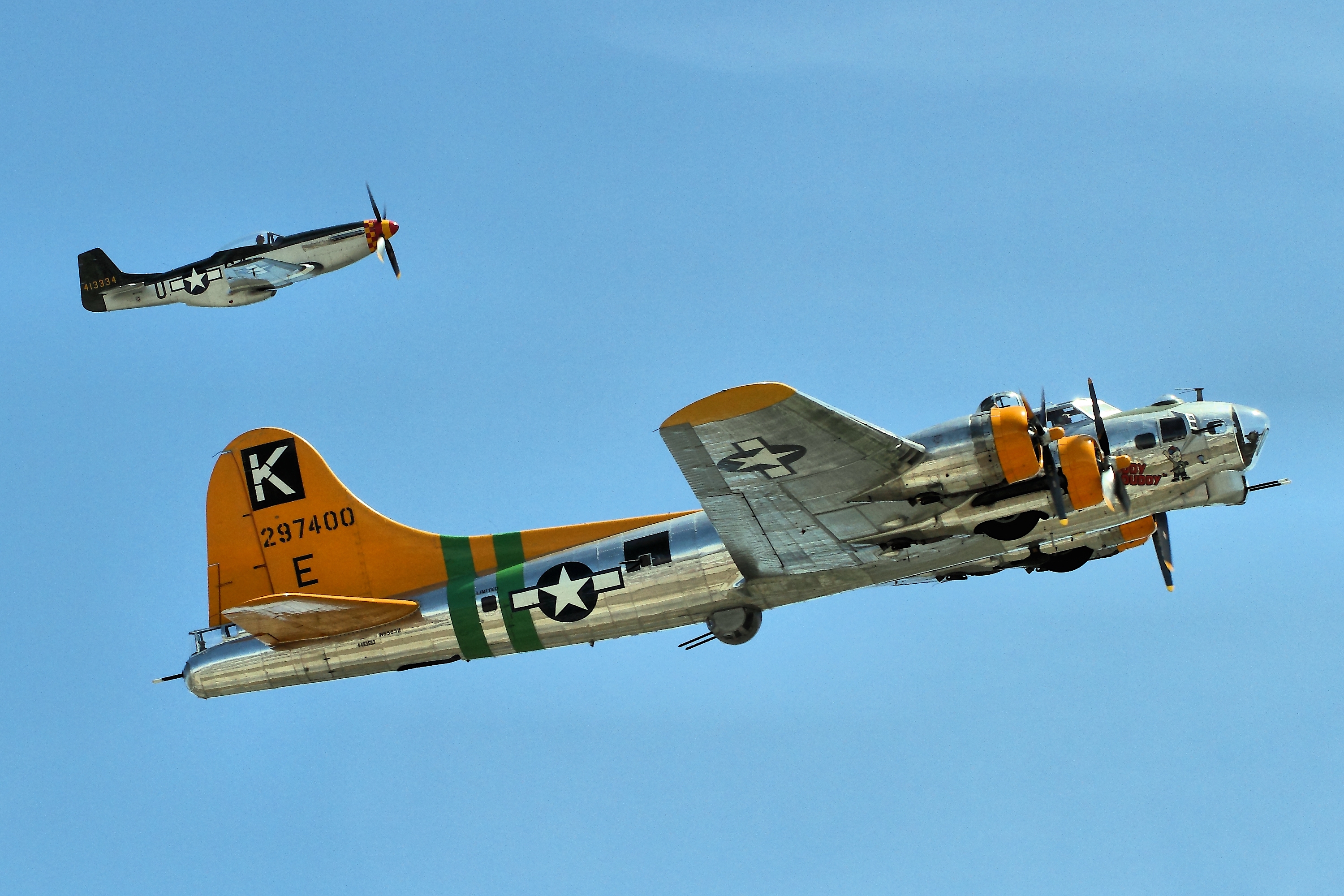 A U.S. P-51 Mustang fighter and B-17 Flying Fortress bomber at the Chino Airshow in California, 2014. The Mustang acted as a long-range fighter escort to the B-17 during bombing raids such as those over Germany in the latter stages of the Second World War (1939-43).