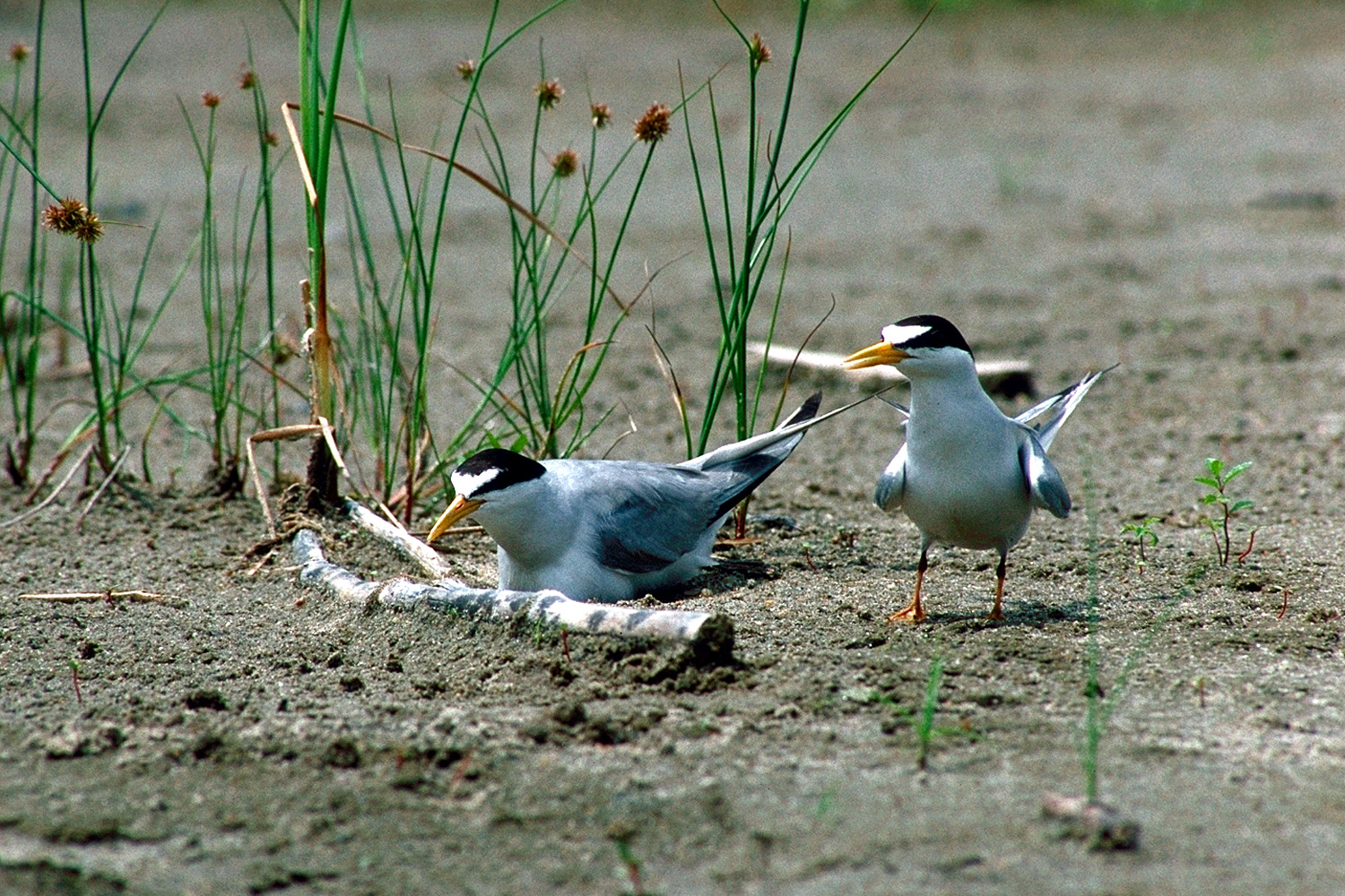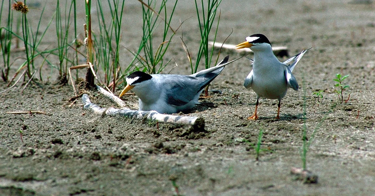 A nesting least tern pair in the sandbar habitat on the Missouri River below Gavins Point Dam. Yankton, South Dakota, USA. Photograph and caption by Robert Etzel.