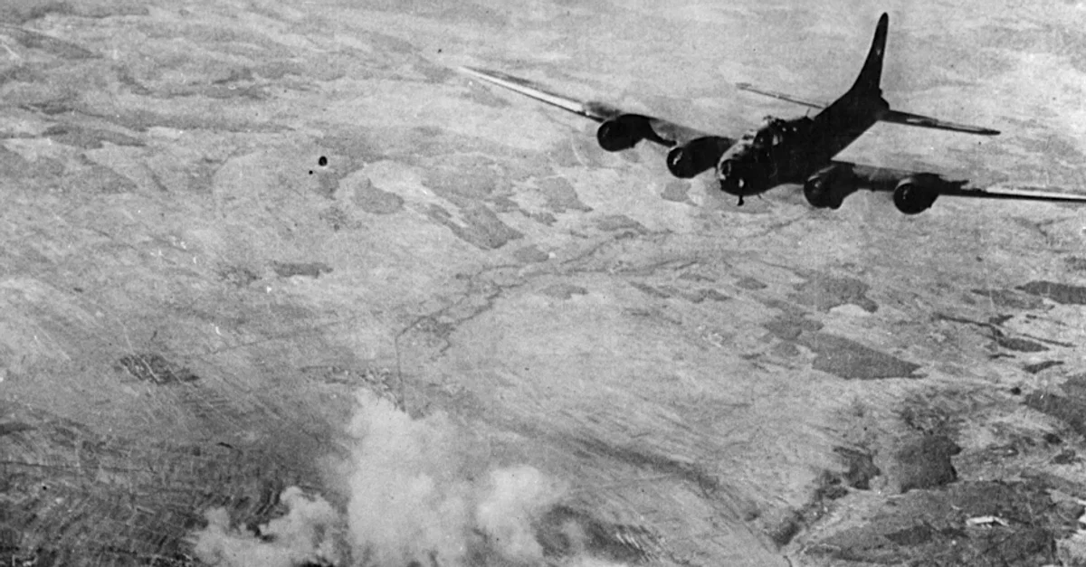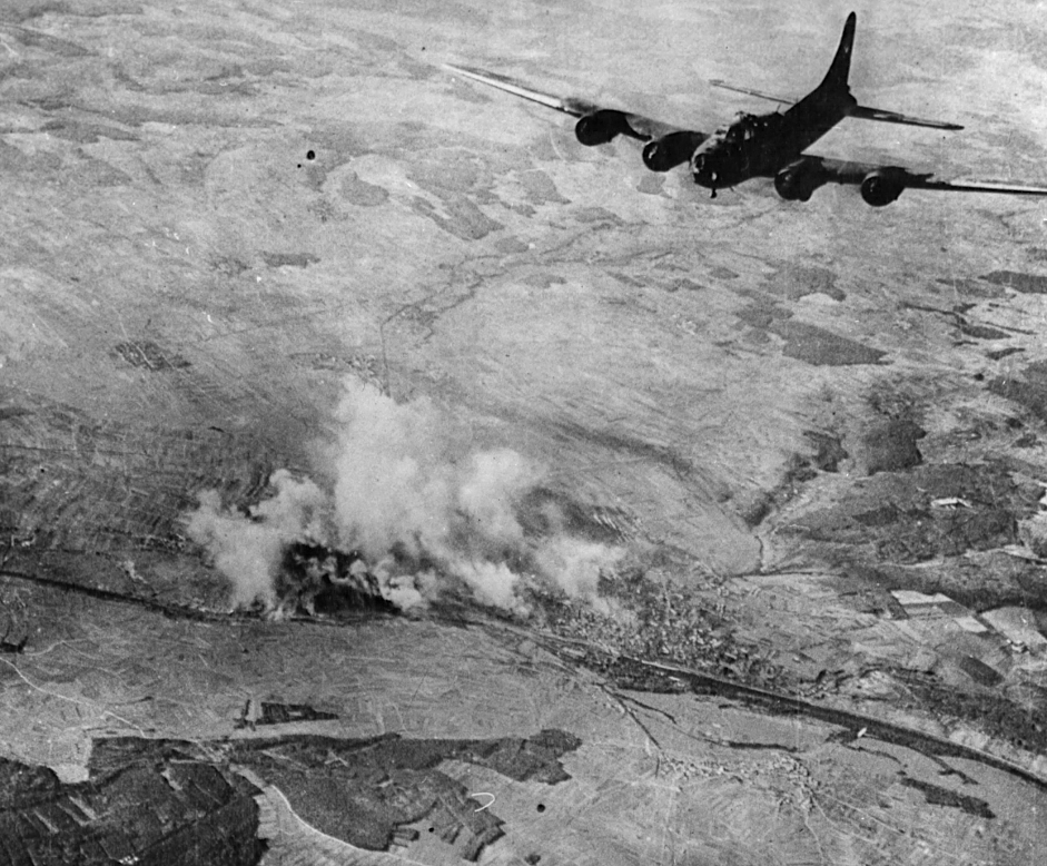 A photograph of a USAAF B-17 Flying Fortress over Schweinfurt, hit because of its ball-bearing factories in August and again in October 1943.