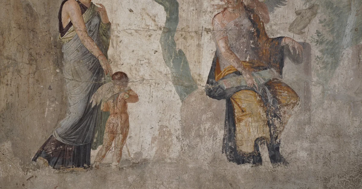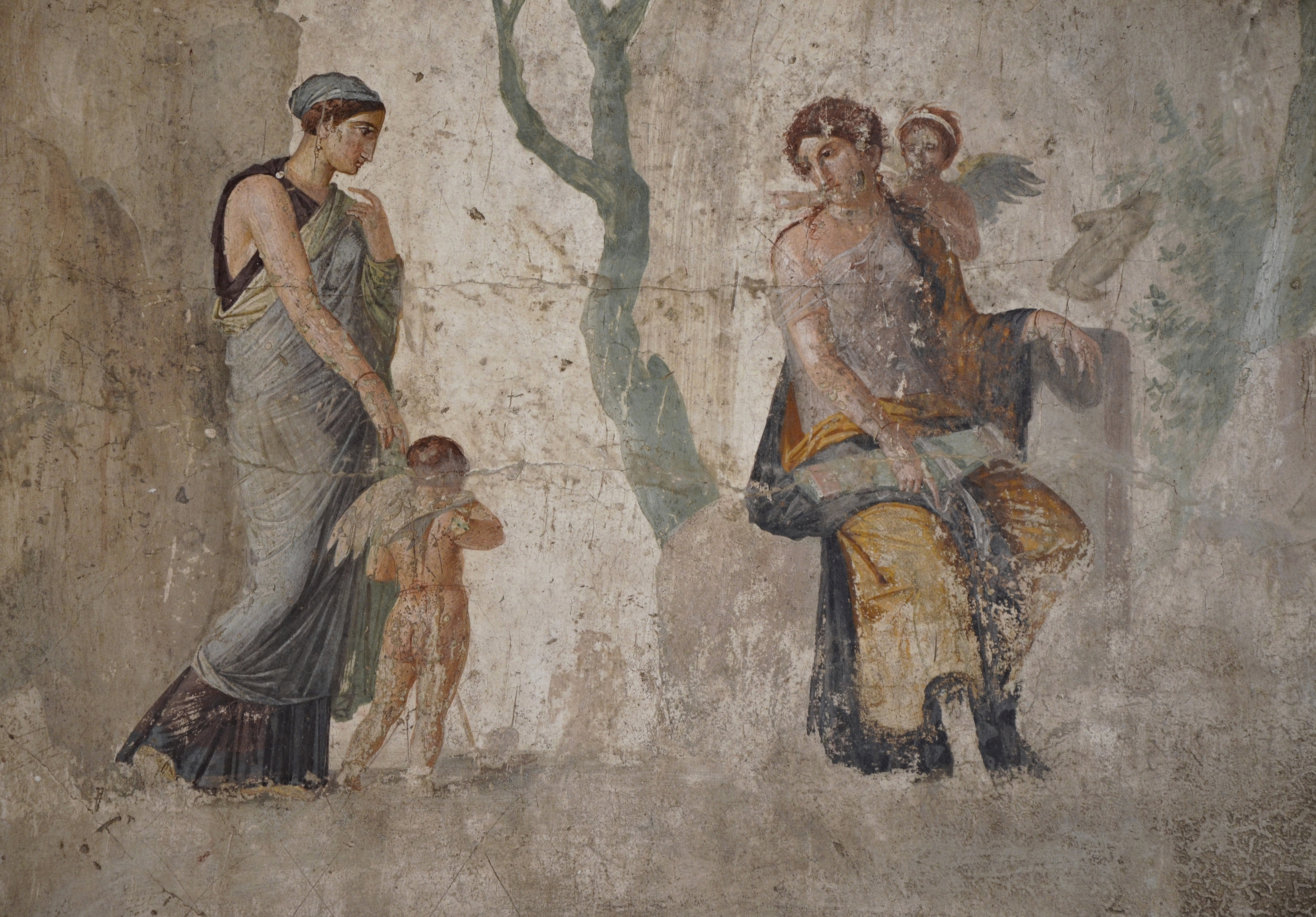 Fresco representing the punishment of Eros by Aphrodite (Venus), discovered in the House of Punished Love in Pompeii, 25 BCE, National Archaeological Museum, Naples.