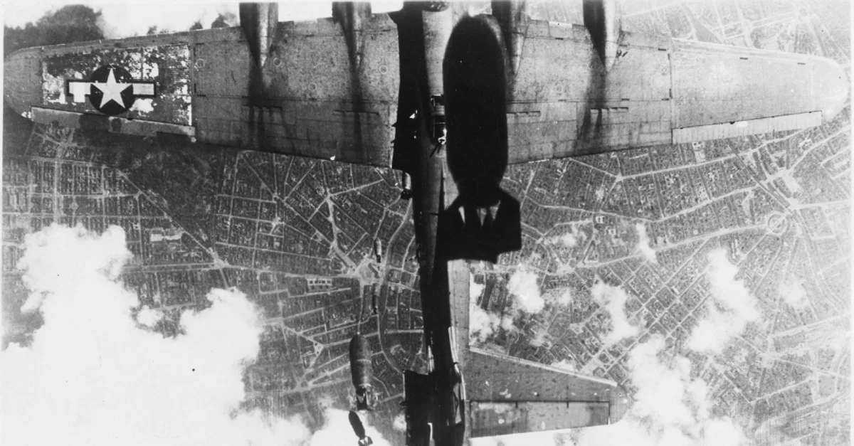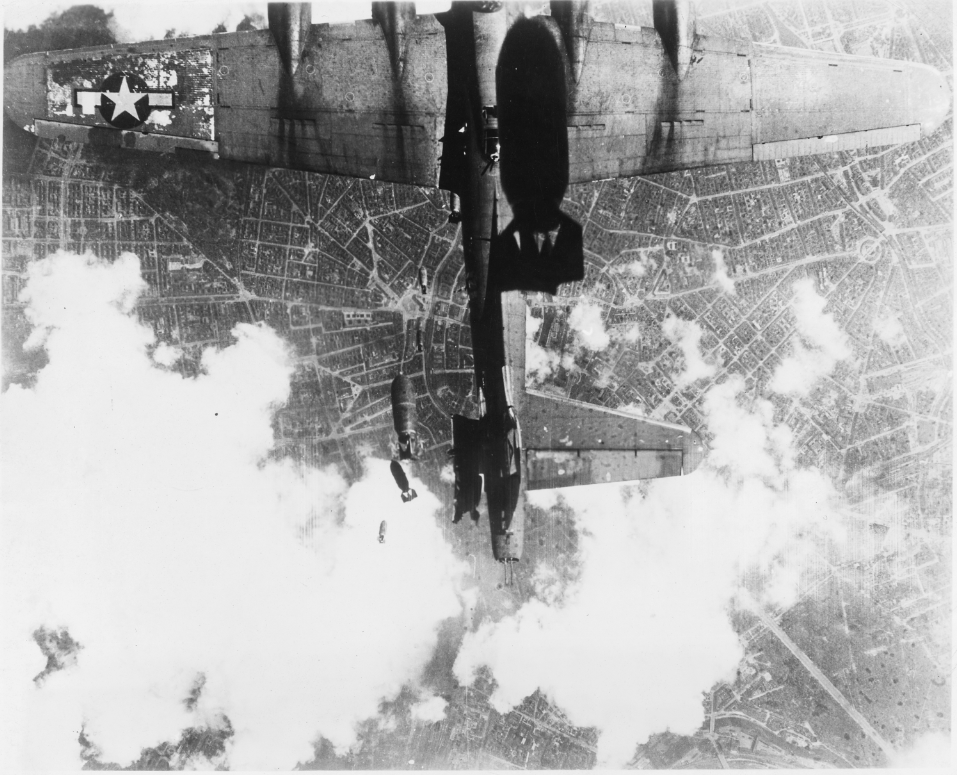 A photograph taken in May 1944 of a United States Air Force B-17 Flying Fortress bomber over Berlin. The bomber has been damaged by bombs dropped from another plane in the formation. (Franklin D. Roosevelt Presidential Library and Museum)