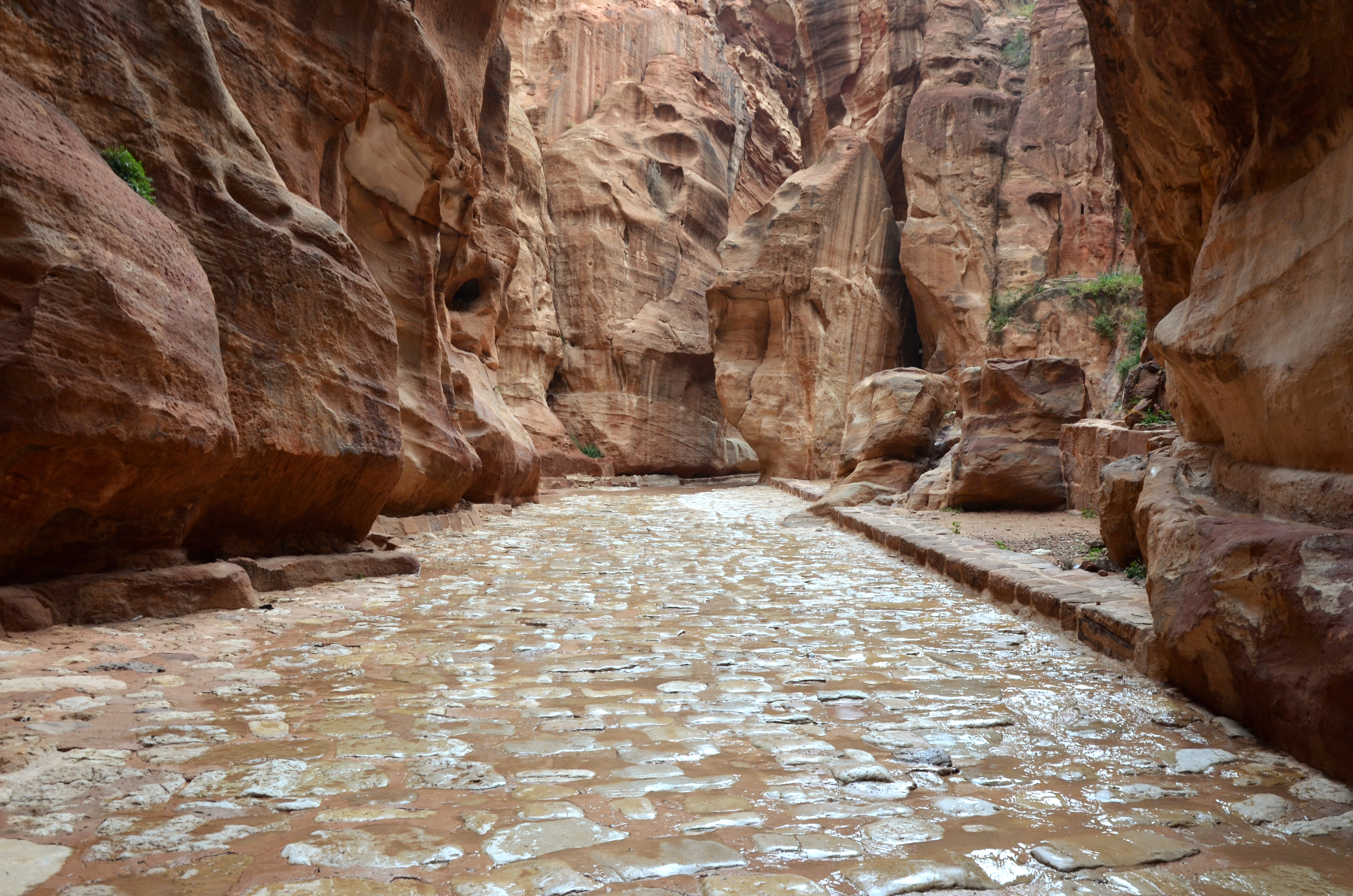 The Siq is the main entrance to the ancient Nabataean city of Petra in southern Jordan. It is a narrow gorge that winds its way approximately 1.2 kilometres (3/4 mi) and ends at Petra's most elaborate ruin, the Treasury (Al Khazneh). The many remnants of Nabataean history can be seen inside the Siq, including the Pave Road, originally constructed towards the end of the 1st century BCE.