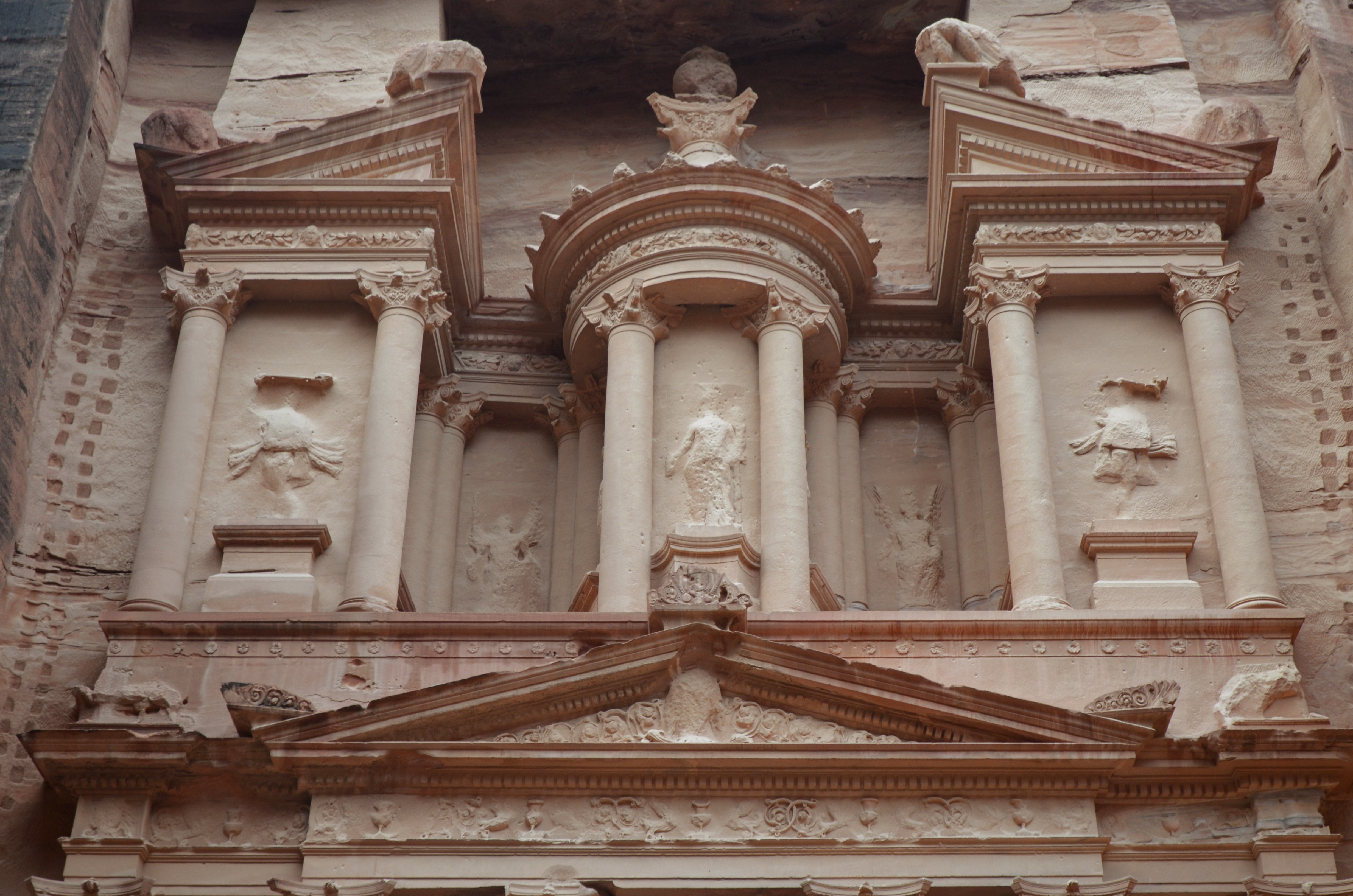 The upper level of the Treasury (Al-Khazneh) of Petra (Jordan) has a circular temple structure (tholos) with a conical roof between recessed Corinthian colonnades and two projecting pavilions capped by half pediments.