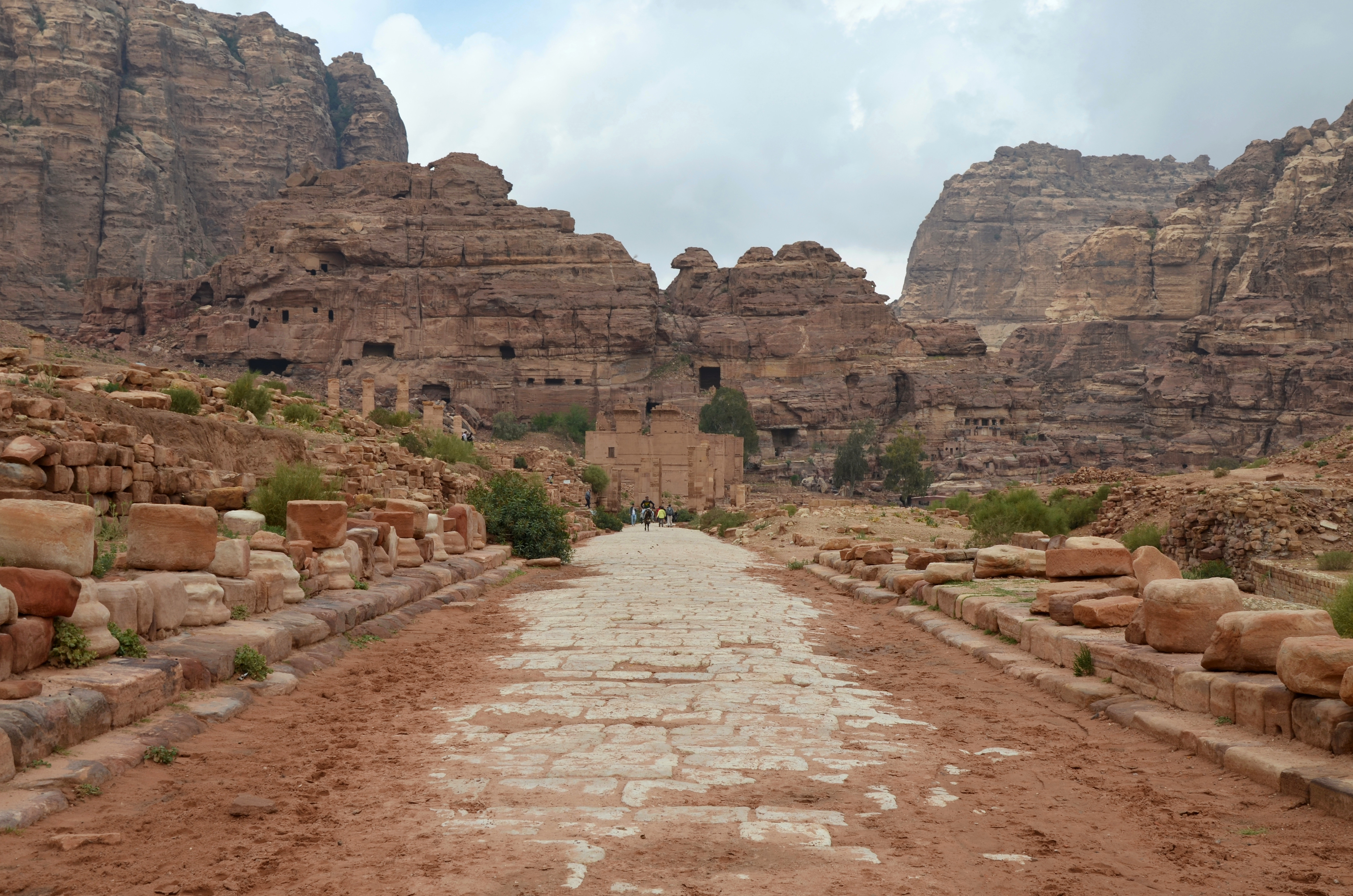 The colonnaded street of Petra (Jordan) marked the centre of the ancient city. A double row of columns lined the 6m-wide carriageway, and covered porticoes gave access to commercial shops on its south side. At the end of the colonnaded street, a monumental triple-arched gate marked the access to the sacred open precinct of the Qasr al-Bint. The colonnaded street was built around 106 CE during the Roman occupation.