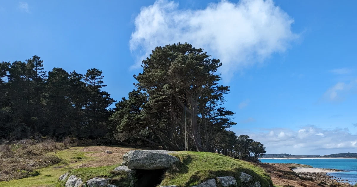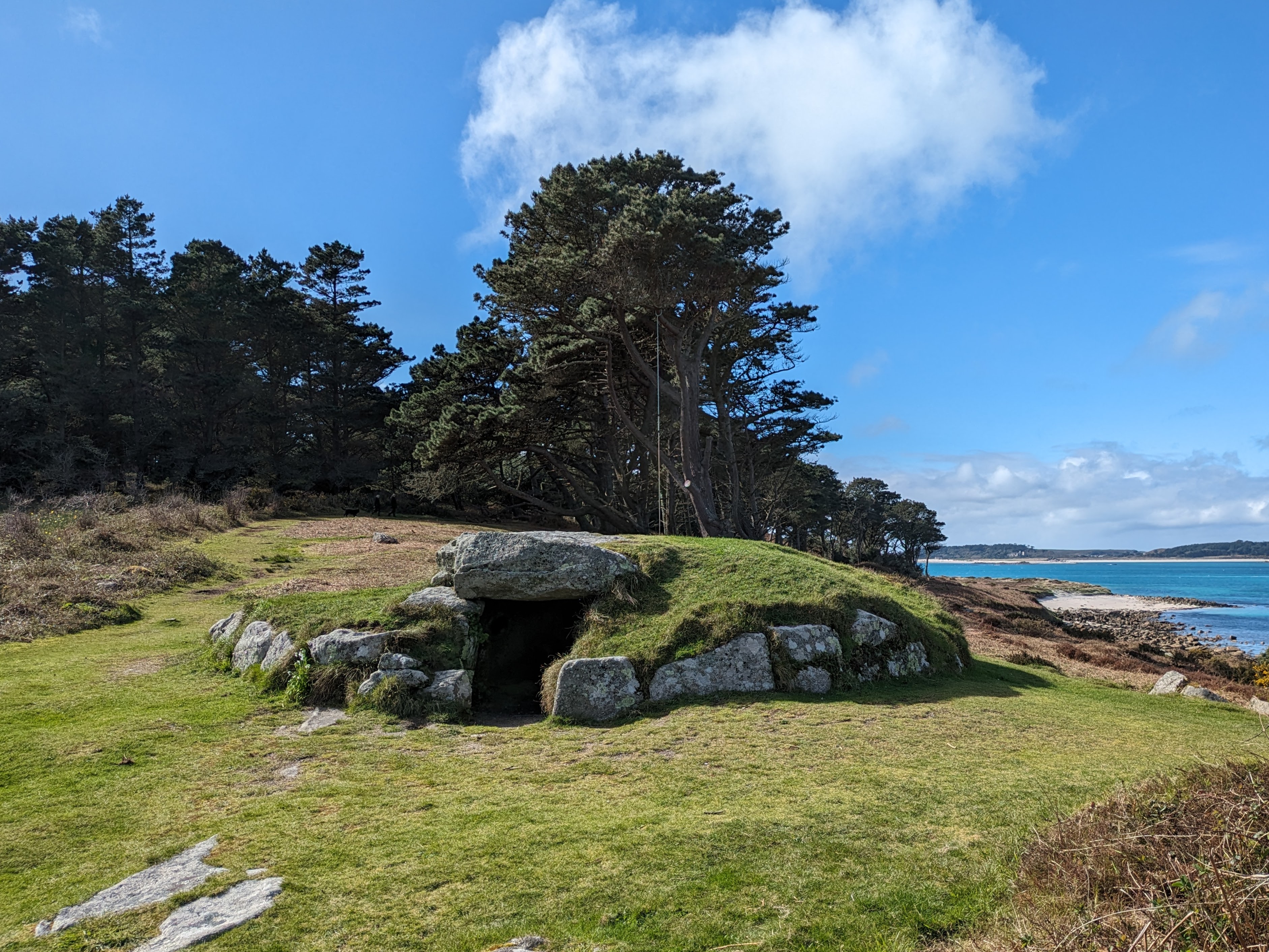 This burial mound is found on the island of St. Mary's in the Isles of Scilly. This cairn is well-preserved with a substantial mound, a stone berk, and an intact inner chamber. Its precise date of construction is still unknown, was likely built during early Bronze Age, circa 2500 to 800 BCE. The site is currently maintained by English Heritage.