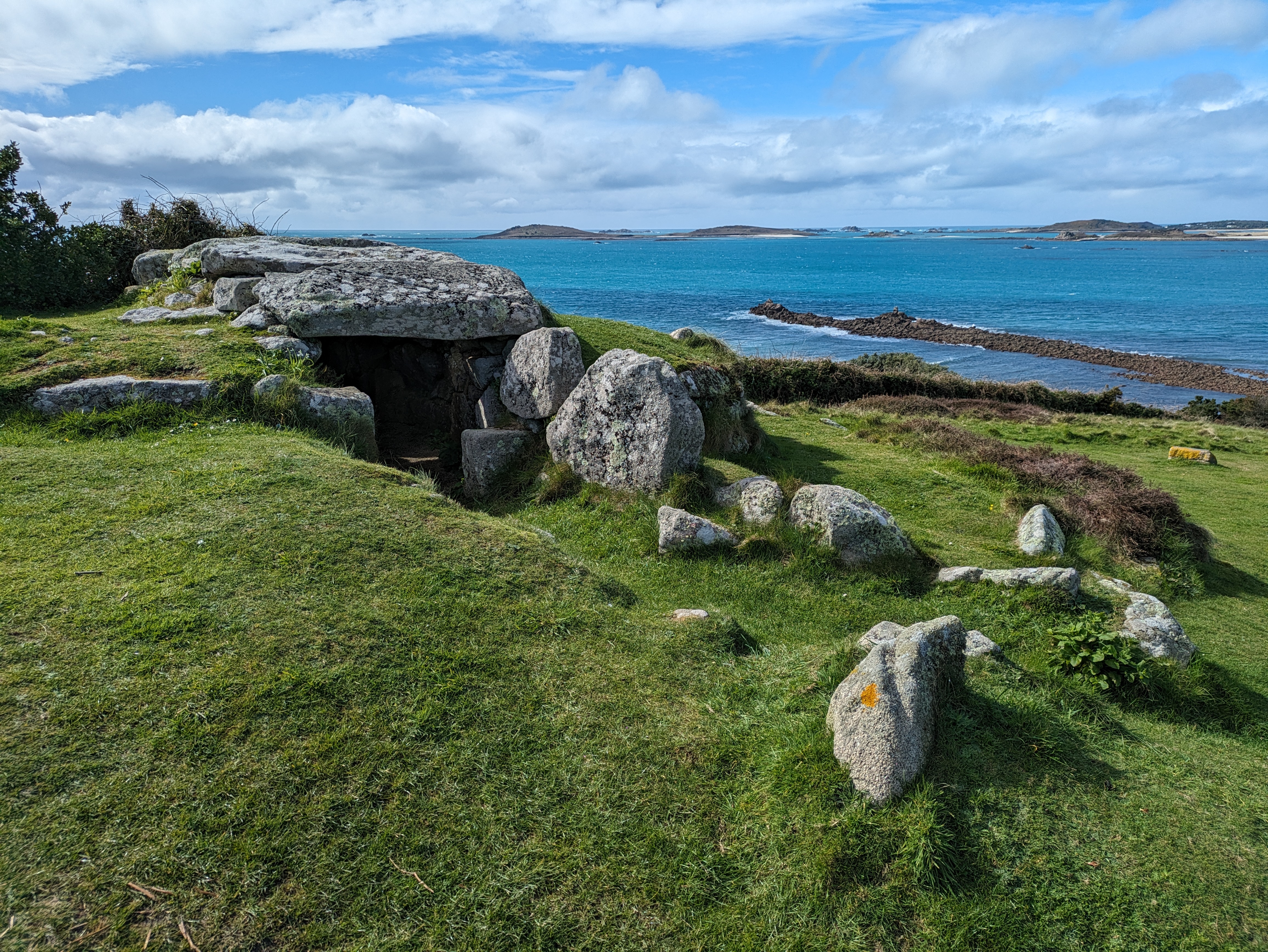 Bant's Carn is a Scillionian entrance grave in very well-preserved condition. It is located on the island of St. Mary's in the Isles of Scilly, UK. It was excavated in 1900 by the archaeologist George Bonsor where he found piles of cremated bones at the end of the chamber as well as Bronze Age pottery shards. The burial chamber is surrounded by a round cairn that is surrounded by a stone kerb.