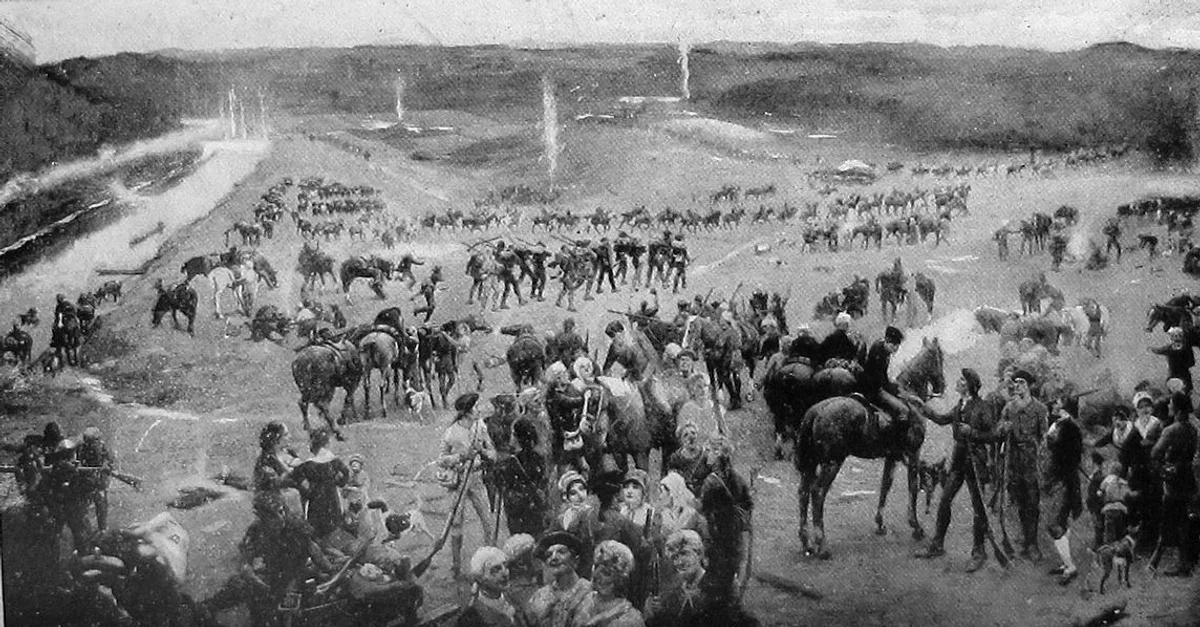 Gathering of the Overmountain Men at Sycamore Shoals, TN, on 25 September 1780, just before the Battle of Kings Mountain. Black-and-white reproduction of a painting by Lloyd Branson, 1915, from the book Andrew Jackson and Early Tennesse History by Samuel G. Heiskell, 1921.