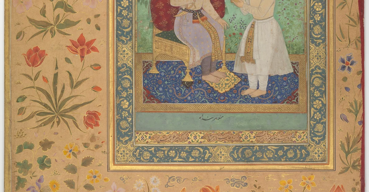 Jahangir and His Vizier, I'timad al-Daula, folio from the Shah Jahan Album, ink, opaque watercolor, and gold on paper by Manohar, India, c. 1615.