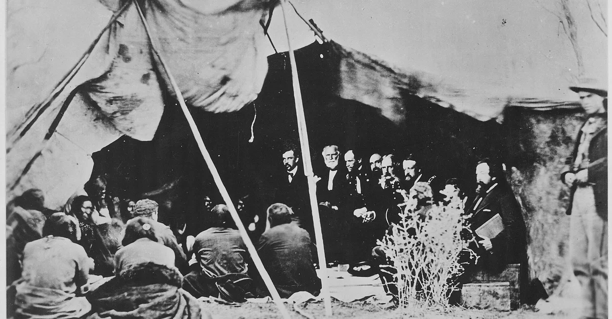 General William T. Sherman and Commissioners in Council with Sioux Chiefs at Fort Laramie, Wyoming, signing the Fort Laramie Treaty, 1868, ending Red Cloud's War. Native Americans are seated on the ground, commissioners on chairs. Seated in the tent are General William S. Harney (with white beard) and General William T. Sherman (head bowed at Harney's left).