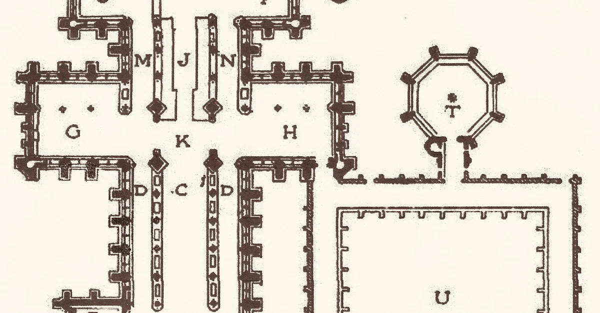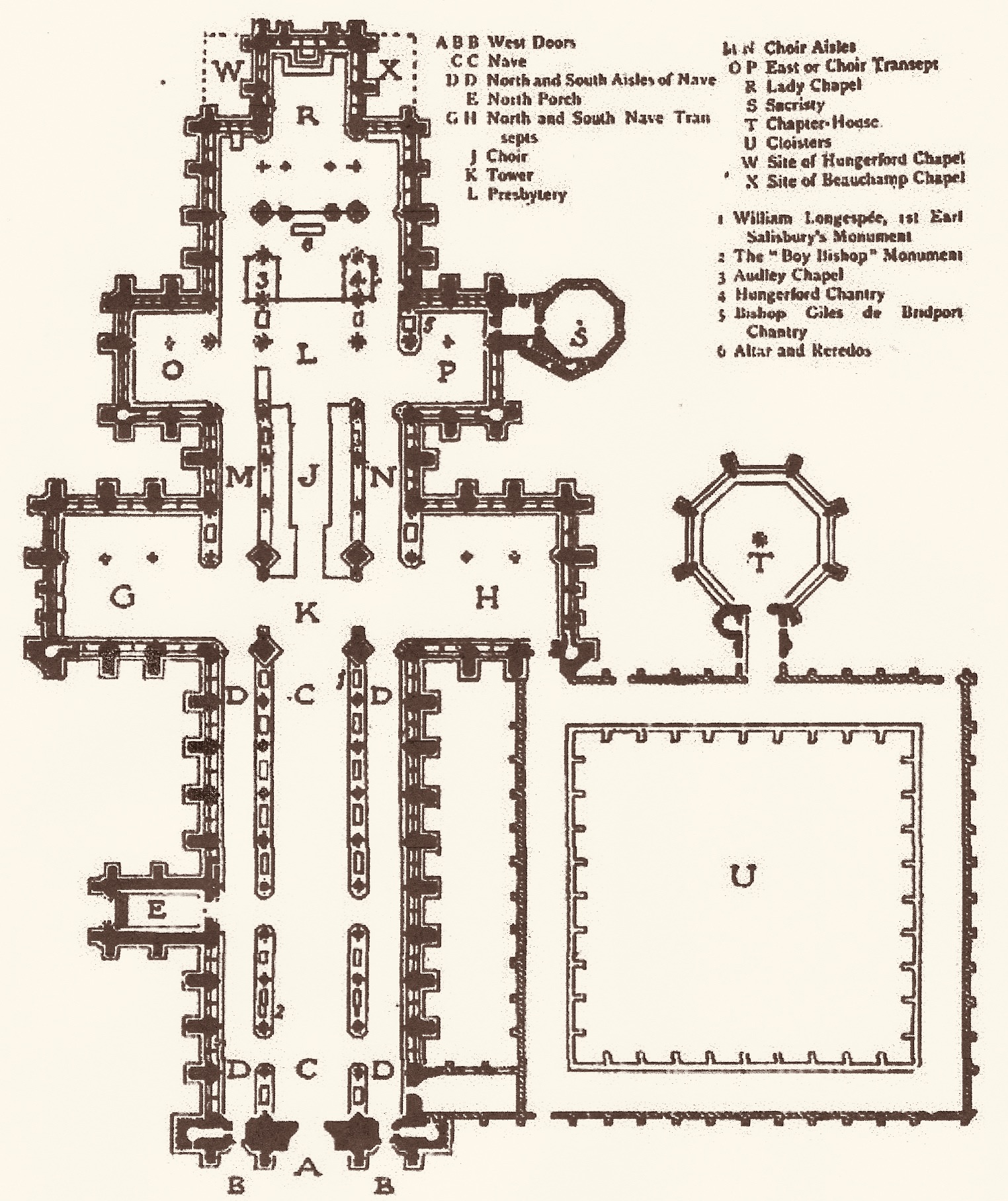 Ground plan of the Salisbury Cathedral showing the development of the layout of churches during the medieval period. Despite the complex layout with multiple aisles, transepts (G, H, O, P) and end (R) and side-chapels (W, X, 3-5), it preserves the basic 2-3 cell layout (C, nave; J, choir/quire; L sanctuary/presbytery).