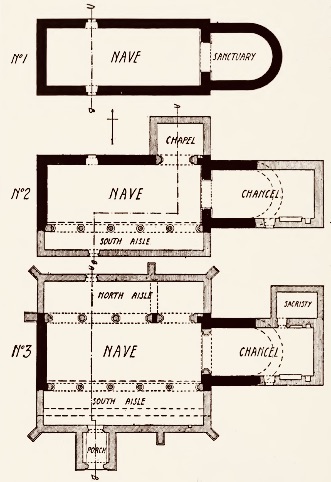 The progression from a basic two-cell building to a more elaborate layout incorporating a divided chancel area, first one extra aisle, then two, plus side chapels. By stage 3 only a few elements (black outline) of the original structure remain.