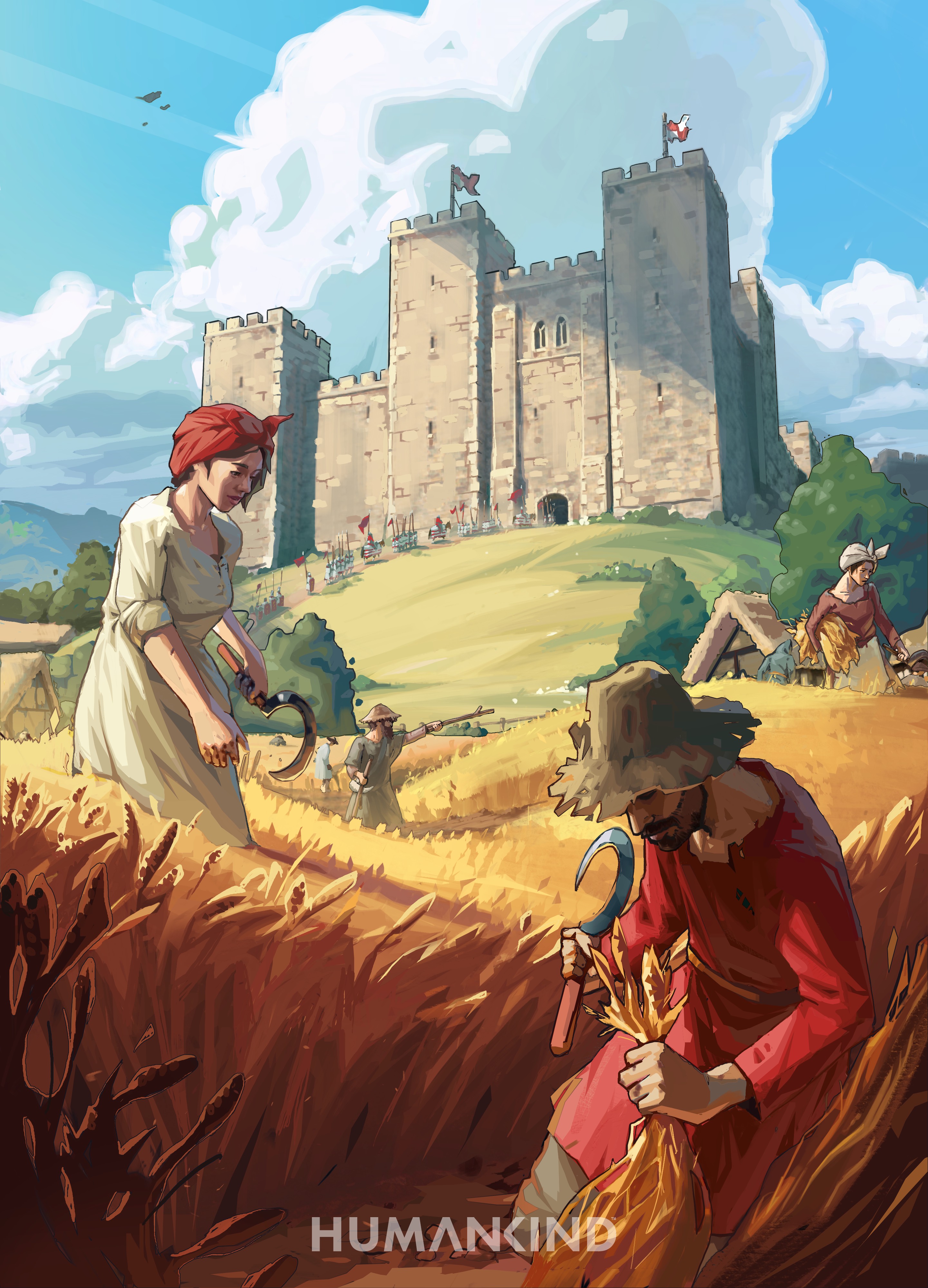 Artist's impression of farmers working a field in medieval England, with a castle in the background. Created by Amplitude Studios for the video game Humankind.