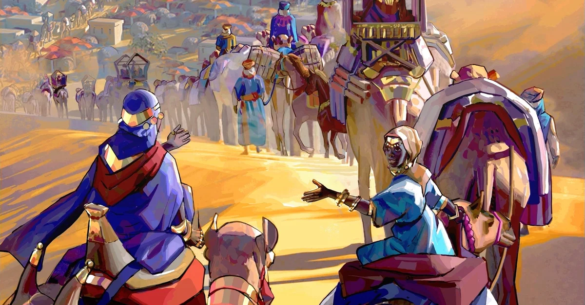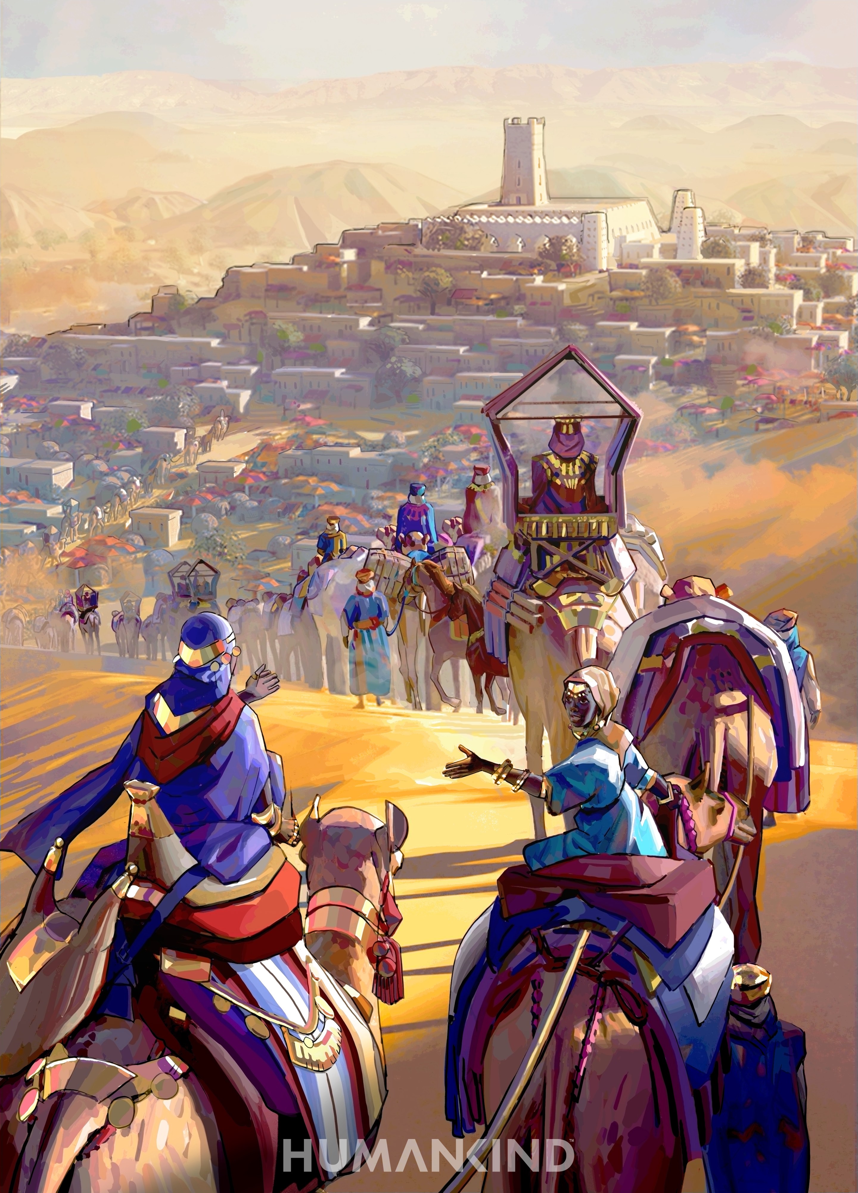 Artist's impression of a royal procession in the medieval Ghana Empire. Created by Amplitude Studios for the video game Humankind.