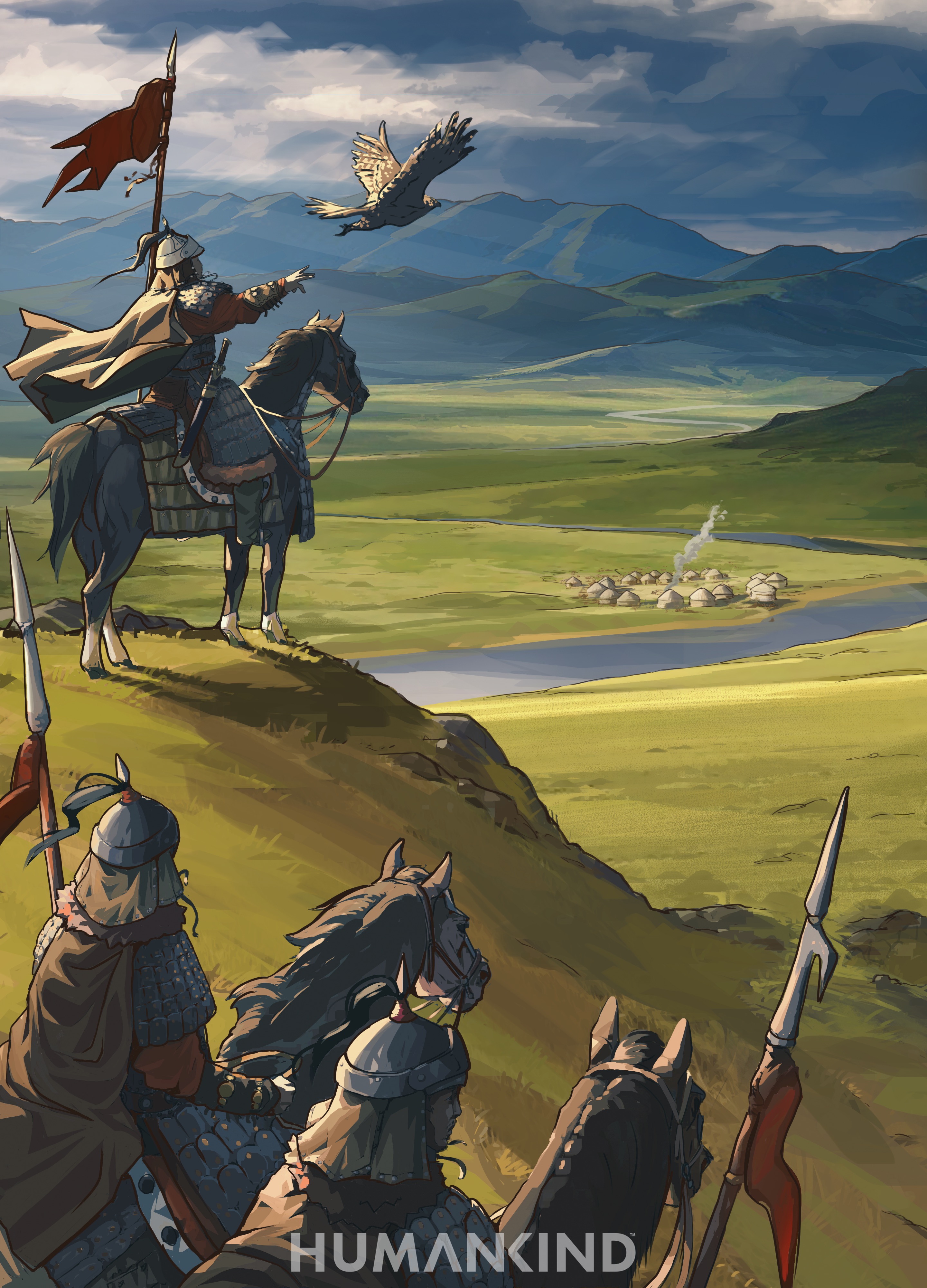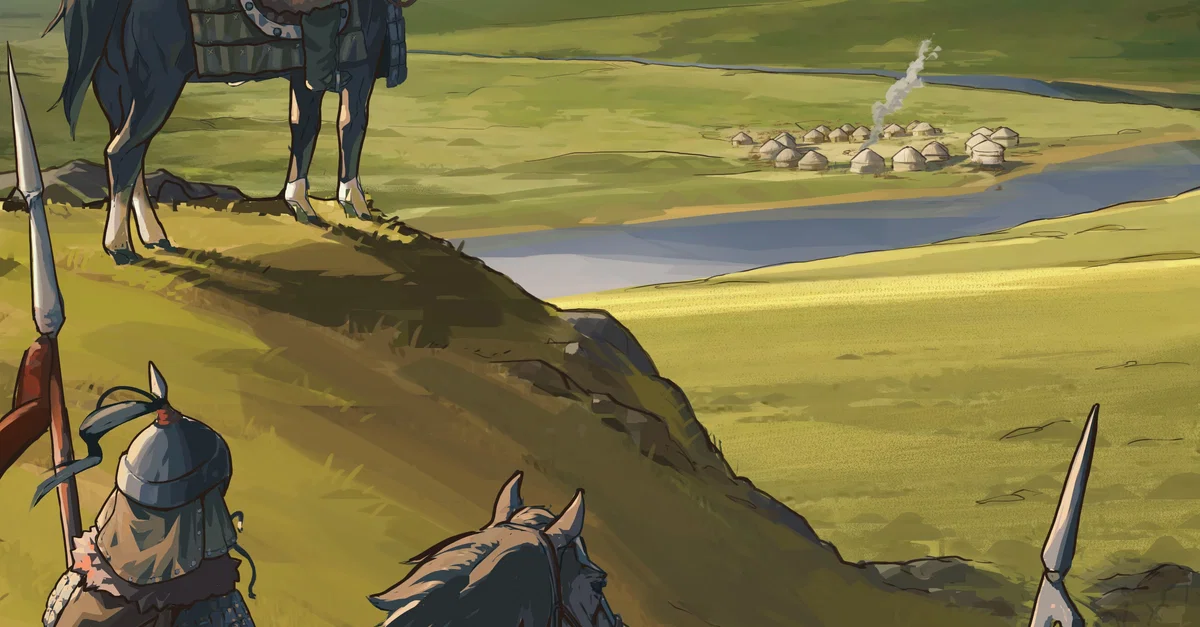 Artist's impression of scouts of the Mongol Empire of Genghis Khan discovering a village on the central Asian steppe. Created by Amplitude Studios for the video game Humankind.