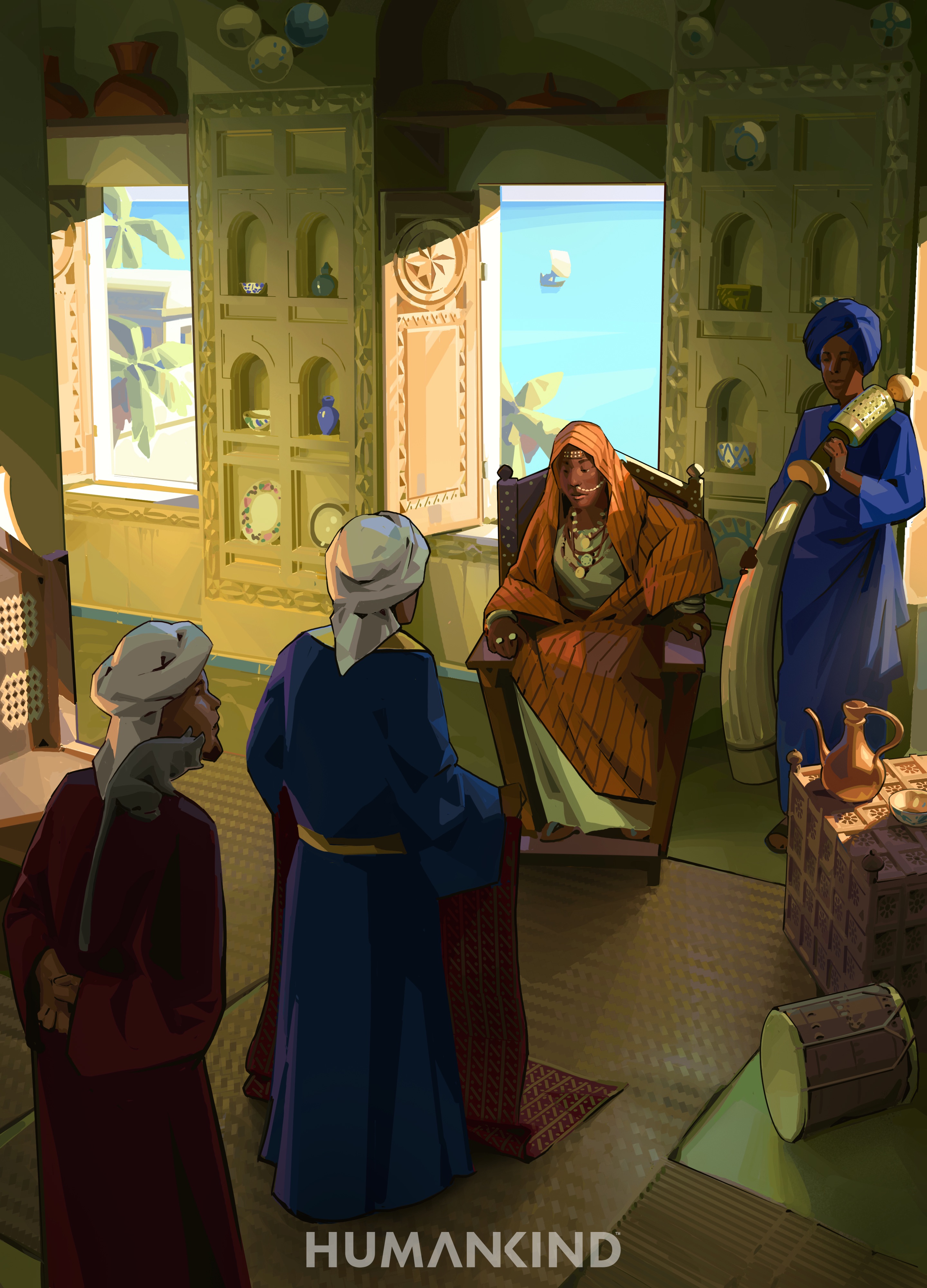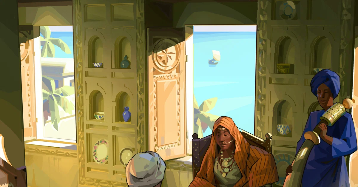 Artist's impression of the house of a rich Swahili merchant whose trade along the Swahili Coast brought wealth to the family. Created by Amplitude Studios for the video game Humankind.