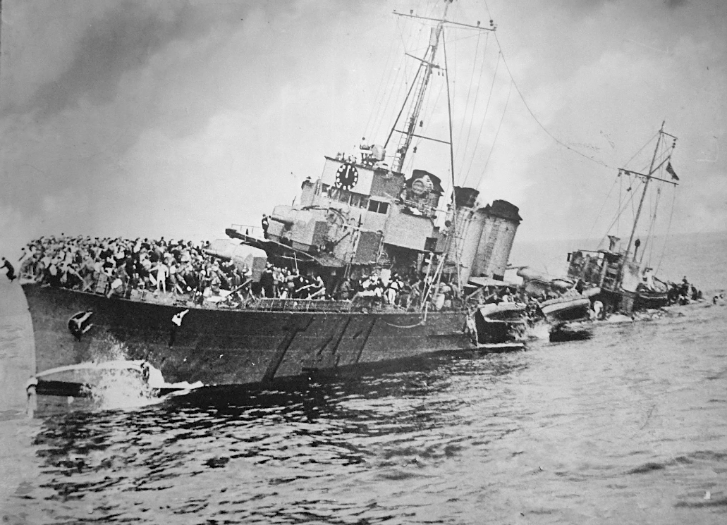 The French destroyer Bourrasque sinking while carrying troops during the Dunkirk evacuation of May-June 1940. (Imperial War Museums)