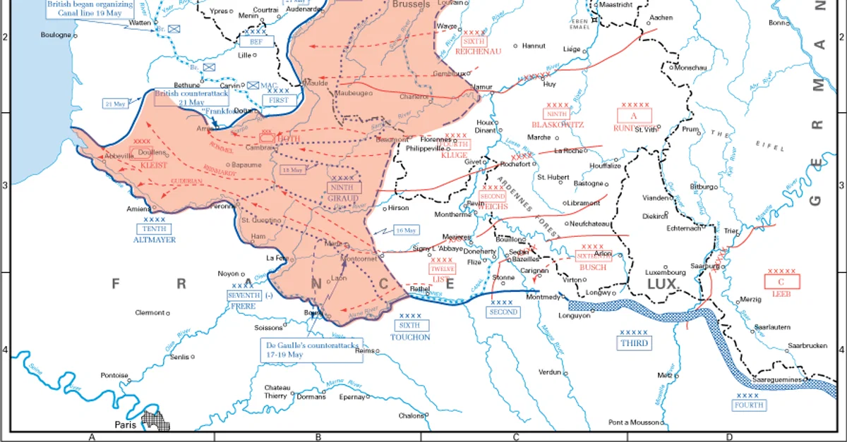 A map showing the German advances through Belgium, the Netherlands, and France which isolated the British Expeditionary Force and necessitated the Dunkirk evacuation of May-June 1940. (United States Military Academy)