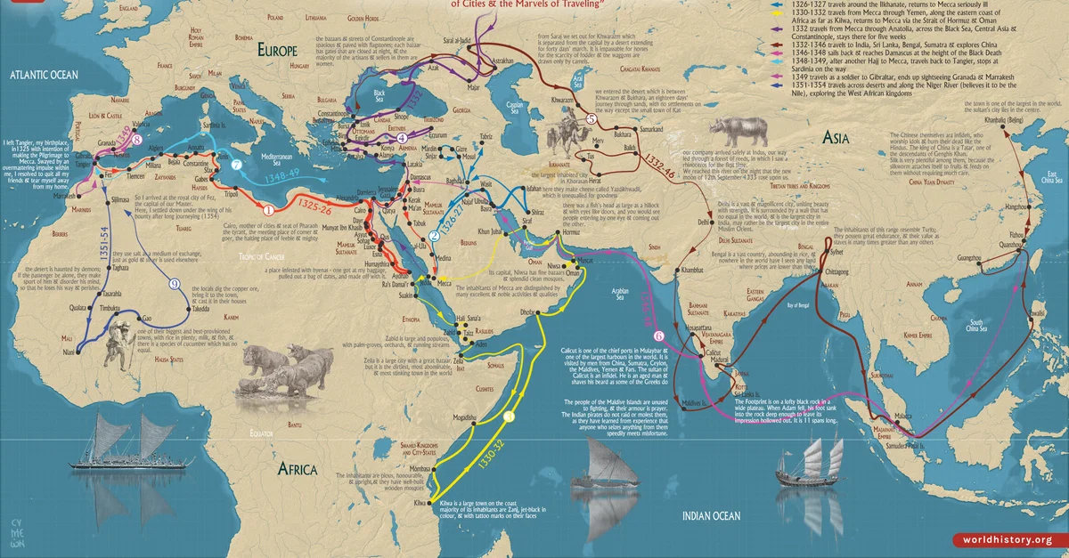 Ibn Battuta (Abū Abd Allāh Muḥammad ibn Abd Allāh Al-Lawātī, 1304–c.1368 CE) was a 14th-century Maghrebi traveler, scholar, and judge whose journeys across the Islamic world and beyond remain among the most remarkable in history. Over a span of nearly thirty years, he covered approximately 75,000 miles (120,000 kilometers), visiting North and West Africa, the Middle East, Persia, Central Asia, India, Southeast Asia, and China. His travels reflected both the vast interconnectedness of the Islamic world under Mongol and post-Mongol rule and the personal devotion of a Muslim jurist seeking knowledge and adventure within the framework of Dar al-Islam (“the Abode of Islam”).