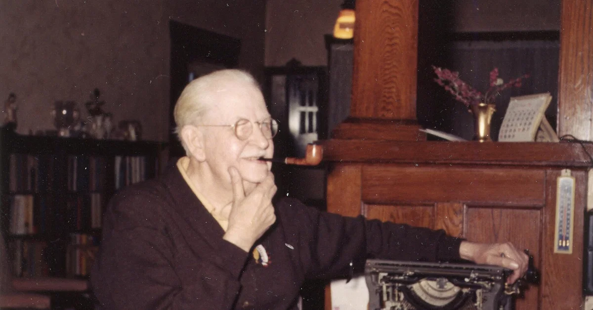 Researcher, historian, and writer George E. Hyde (l. 1882-1968), auto-portrait taken by himself in his study at his home in Omaha, Nebraska, 1959.