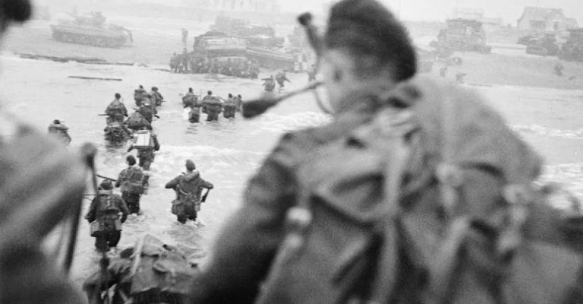 A photograph showing British commandos of the 1st Special Service Brigade attacking Sword Beach on D-Day 6 June 1944. The brigade was led by Lord Lovat (seen in the photo on the right of the column wading in the sea). (Imperial War Museums)