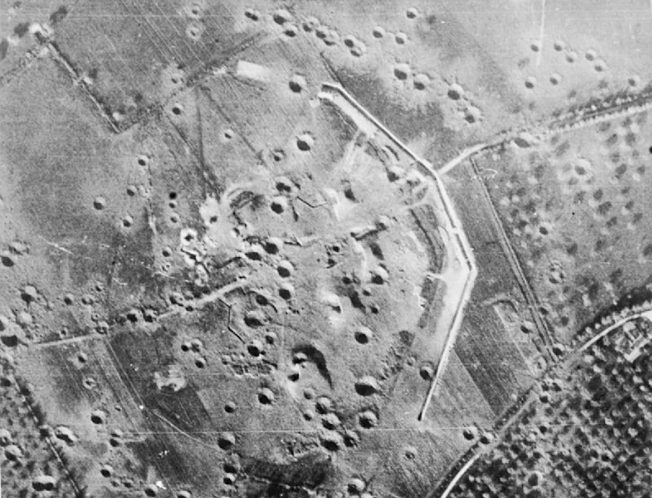 A photograph showing the crater damage inflicted by RAF Lancaster bombers on the German Merville battery on the Orne estuary. The four guns of Merville (believed bigger than they actually were by the Allies) threatened Sword Beach of the D-Day Normandy Landings of 6 June 1944. The guns, protected by thick concrete casements, remained undamaged but were taken by paratroopers of the British 6th Airborne Division. (Imperial War Museums)