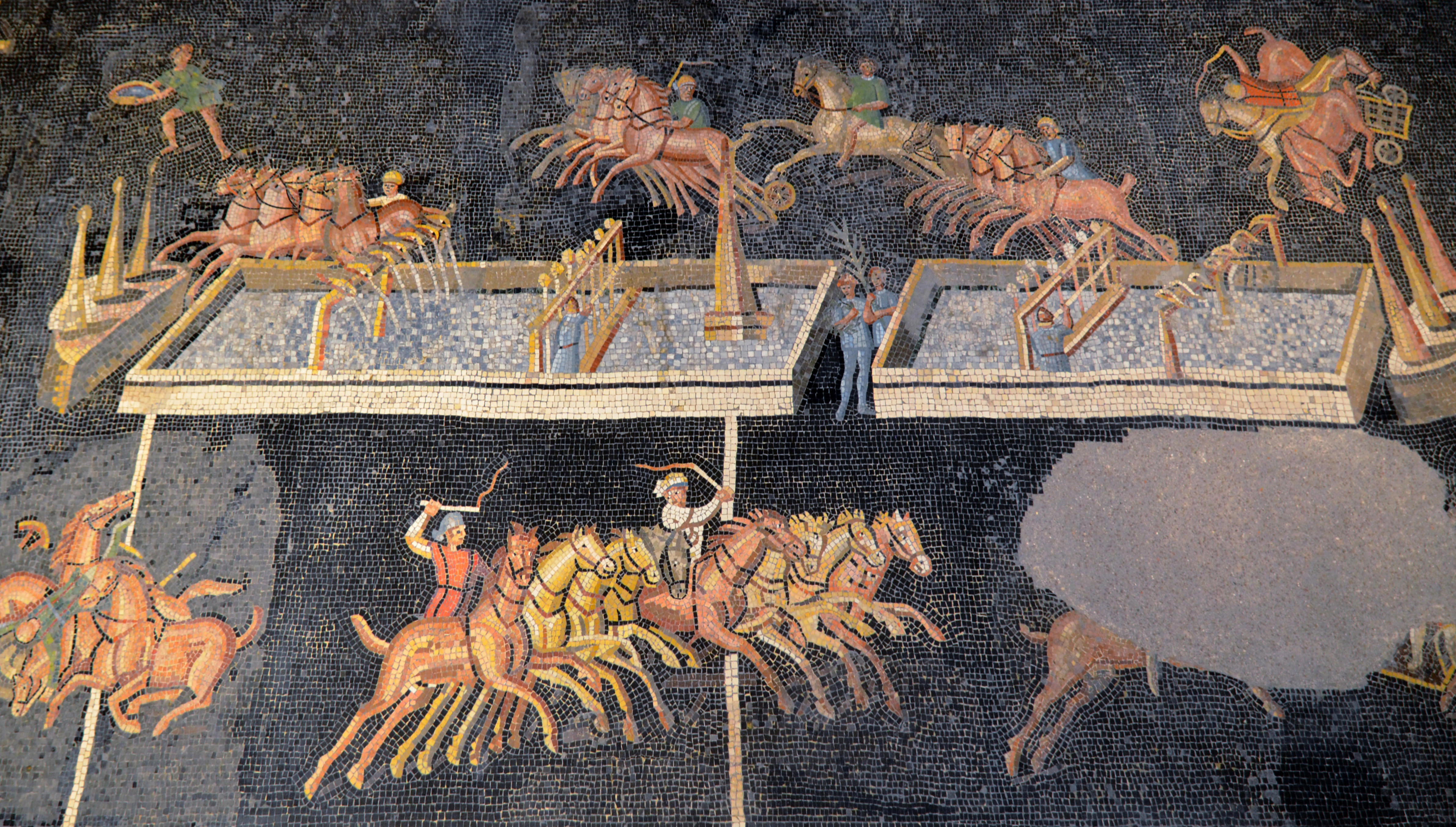 The restored Circus Mosaic from Lugdunum (modern Lyon, France), 2nd century CE. It vividly depicts a chariot race with eight chariots competing, two from each faction. The four teams, known by the colours worn by the charioteers (blue, green, red, and white), represent several successive moments of the race. The spina, the median strip around which the chariots turn, consists of two rectangular pools filled with water and lap markers with seven dolphins and seven eggs. When each lap had been run, a dolphin was tipped downward, and an egg lowered from its bar.
