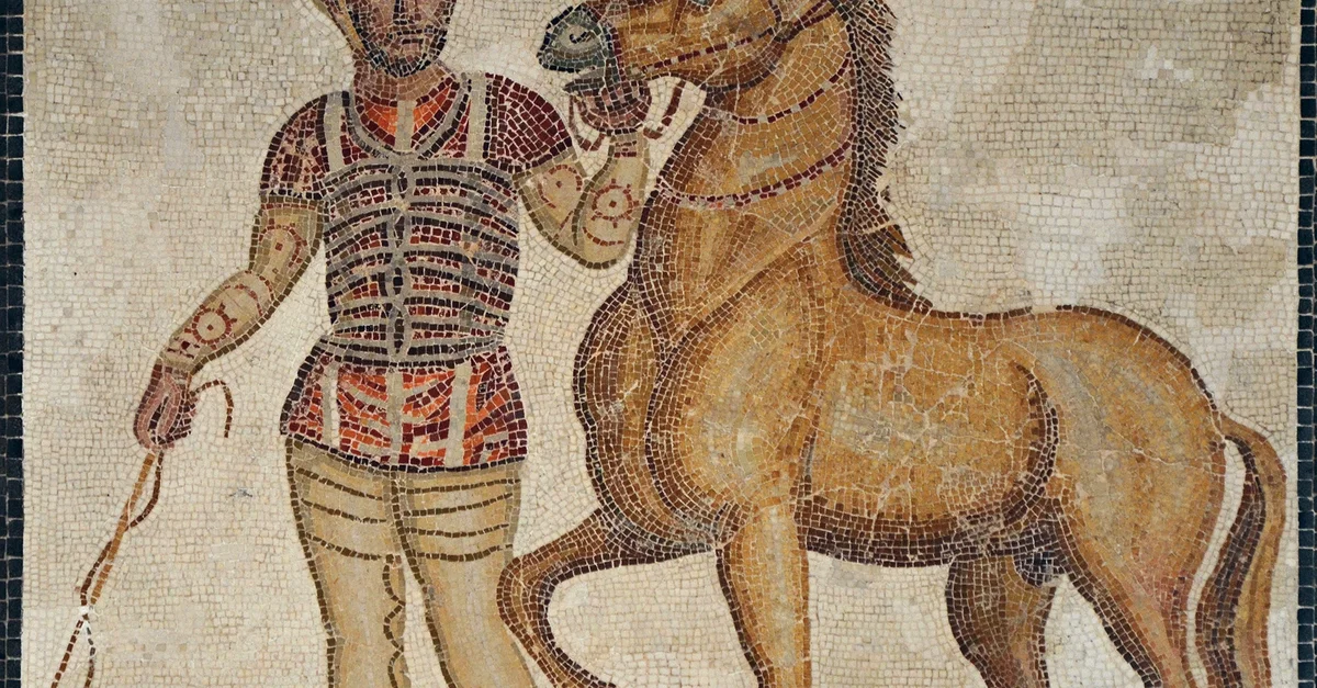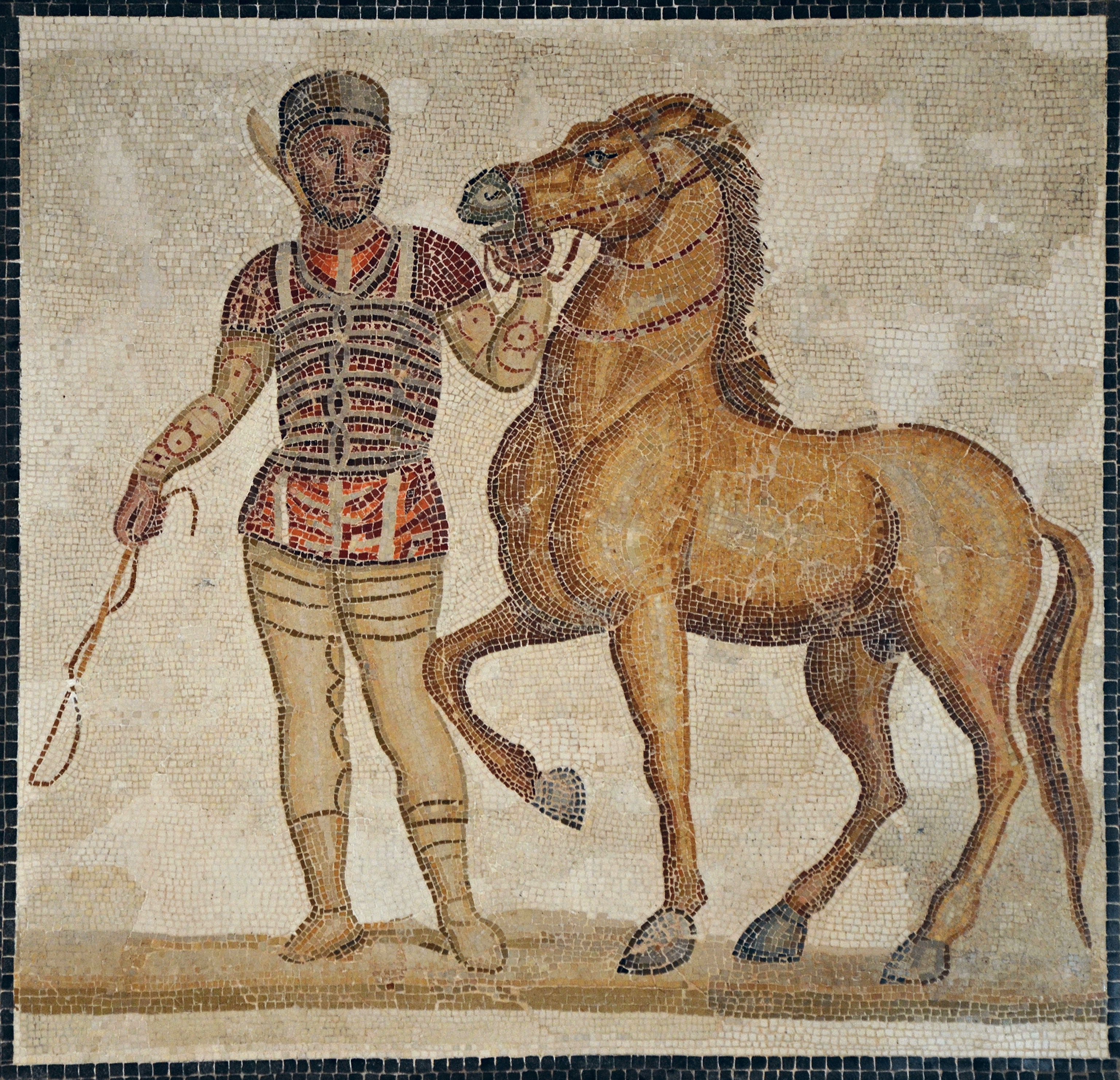Roman mosaic depicting a charioteer and horse from the Red faction (factio russata), 3rd century CE. The charioteer wears a short decorated tunic in the colour of the stable, a leather helmet, and leather strips around the chest, arms, and legs. The four professional stables were known by their team colours: Blue, Green, Red, and White.