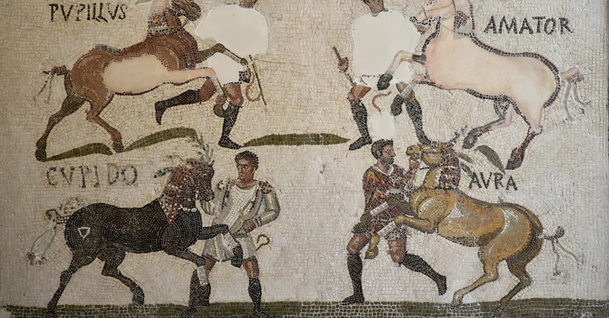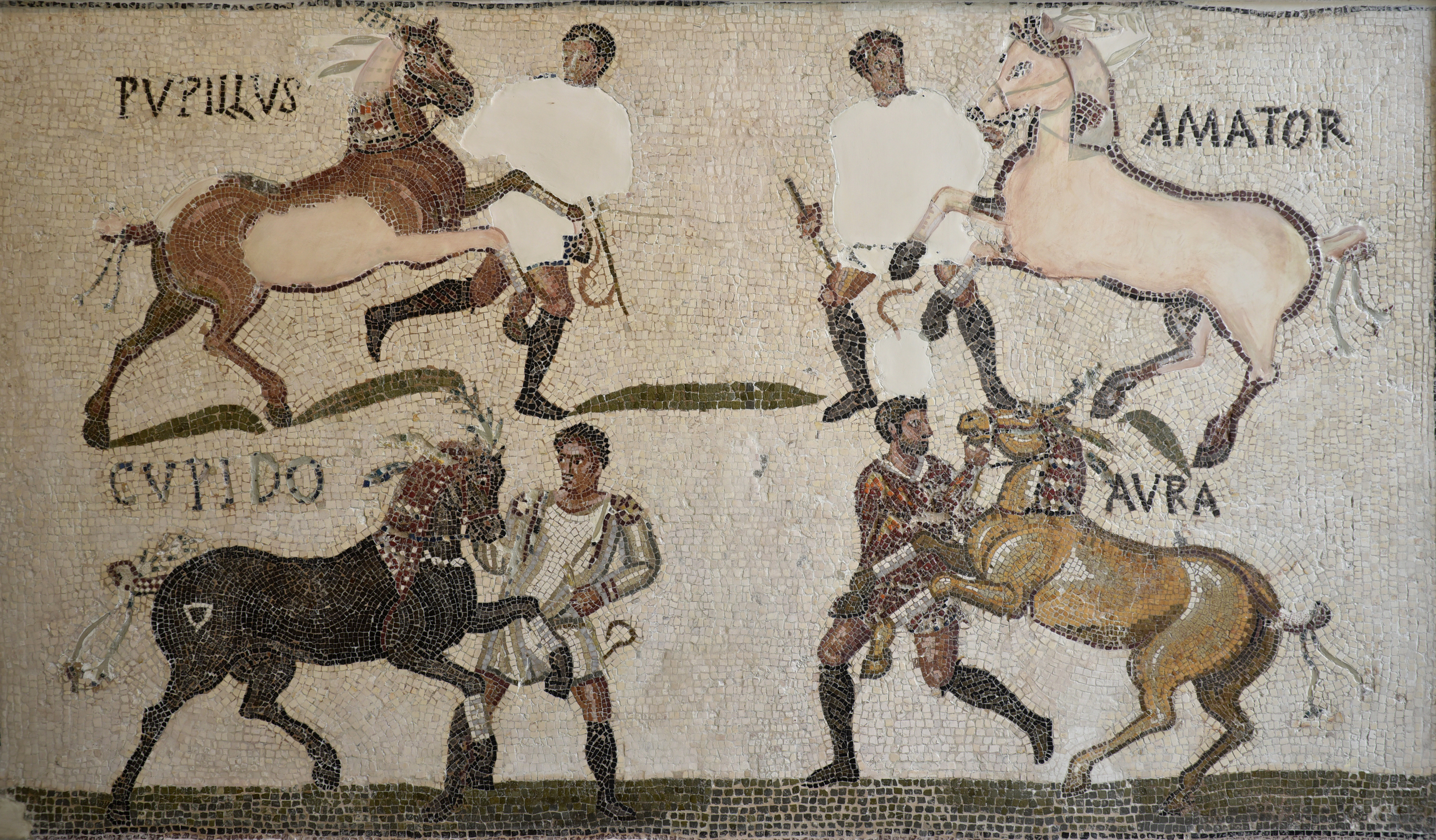 Roman mosaic representing a circus scene, 3rd century CE. It depicts four horses identified by name and their respective charioteers from the four different factions, each indicated by a colour: Pupillus represents the blue faction (factio veneta), Cupido the white (factio albata), Amator the green (factio prasina) and Aura the red (factio russata).