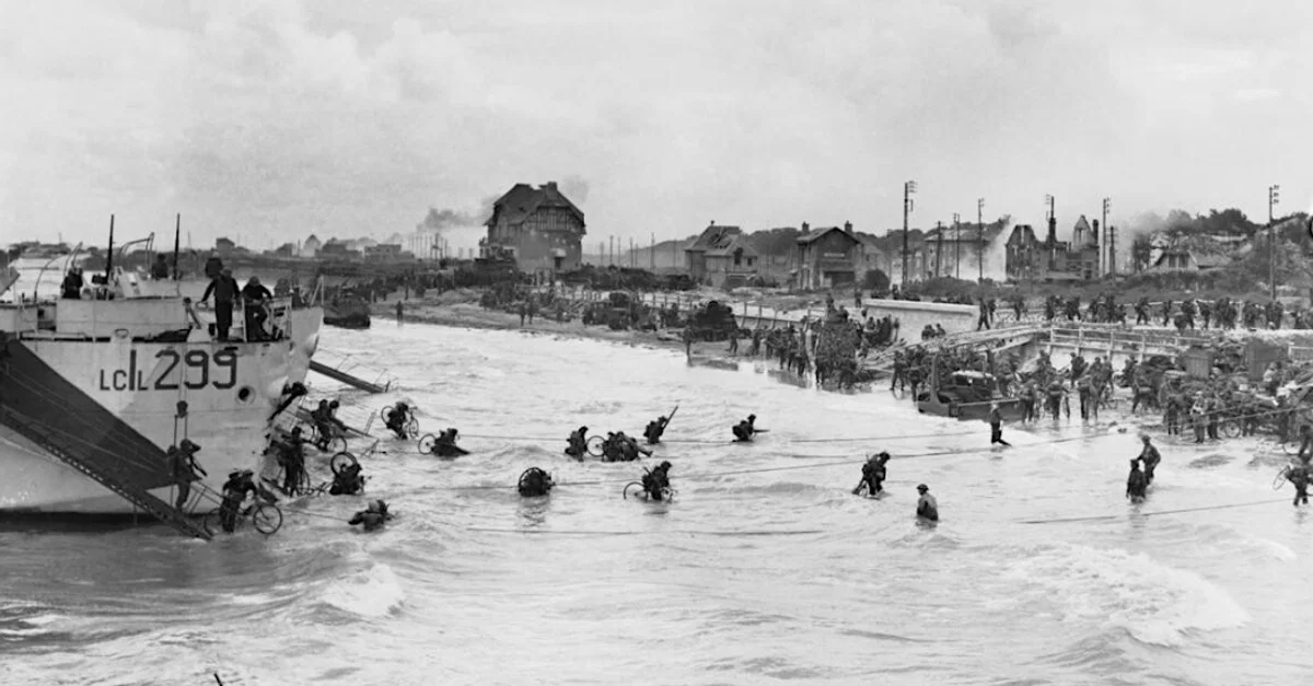A photograph showing members of the 3rd Canadian Infantry Division attacking Juno Beach as part of the Allied D-Day Normandy landings of 6 June 1944. In the background is Bernieres-sur-Mer. (Imperial War Museums)