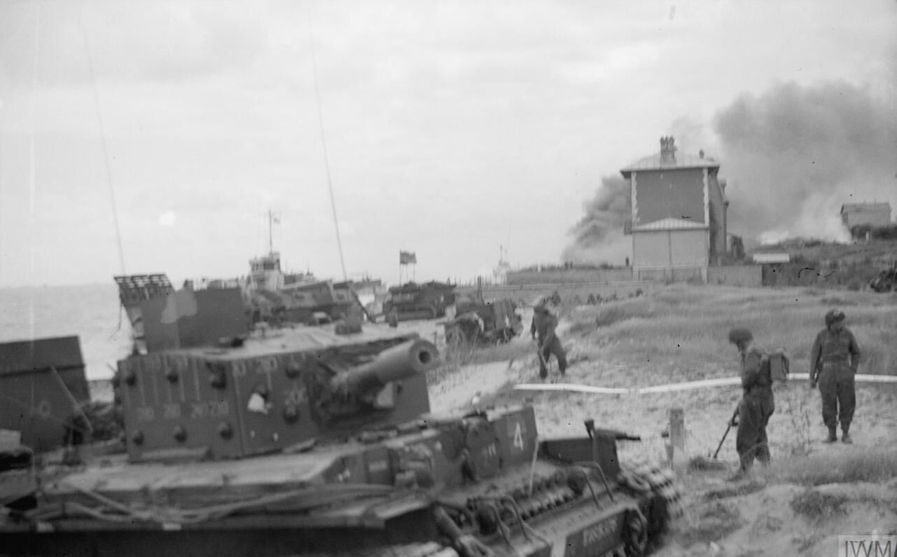 An abandoned Centaur Mk IV belonging to the Royal Marines Armoured Support Group, on Juno Beach on D-Day. St Aubin-sur-Mer, 6 June 1944. (Imperial War Museums)