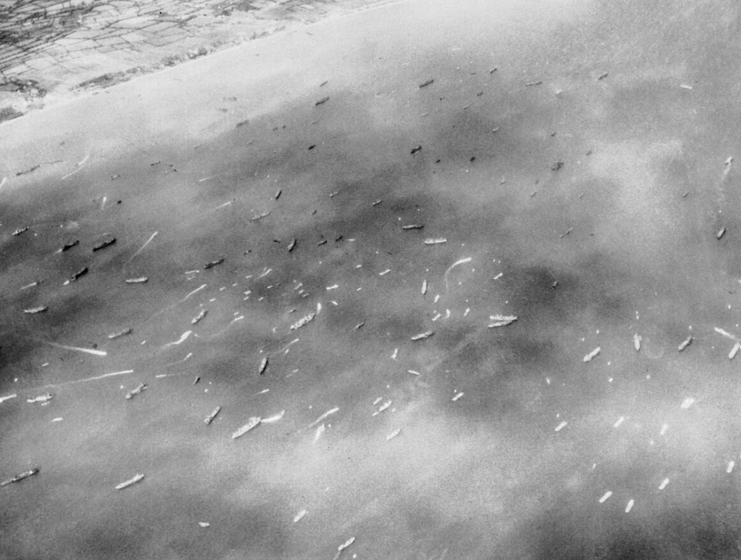 An aerial photograph showing the landing craft and barrage balloons which comprised the attack by the U.S. Army on Omaha Beach during the Normandy Landings which began on D-Day 6 June 1944. (Imperial War Musuems)