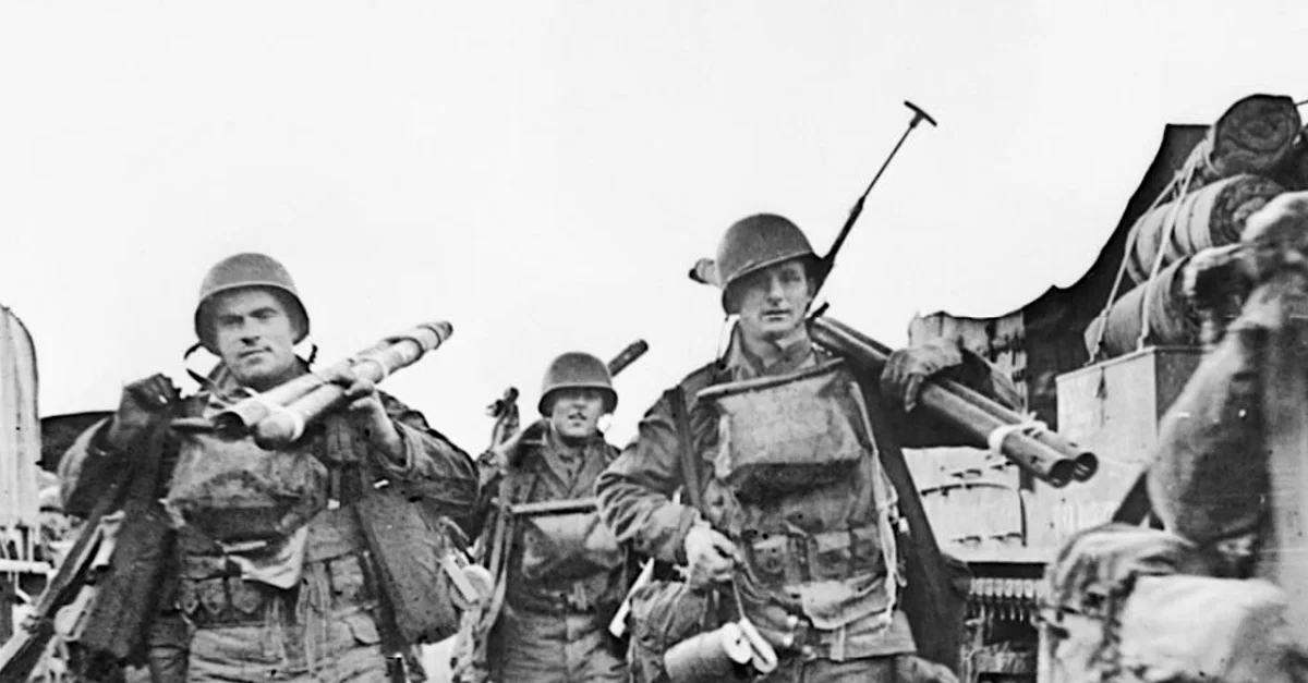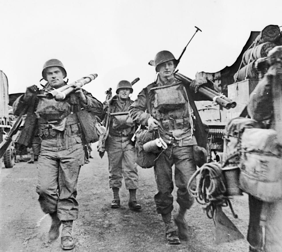 A photograph showing U.S. troops carrying Bangalore torpedos on Omaha Beach during the Normandy Landings which began on D-Day 6 June 1944. (Imperial War Musuems)