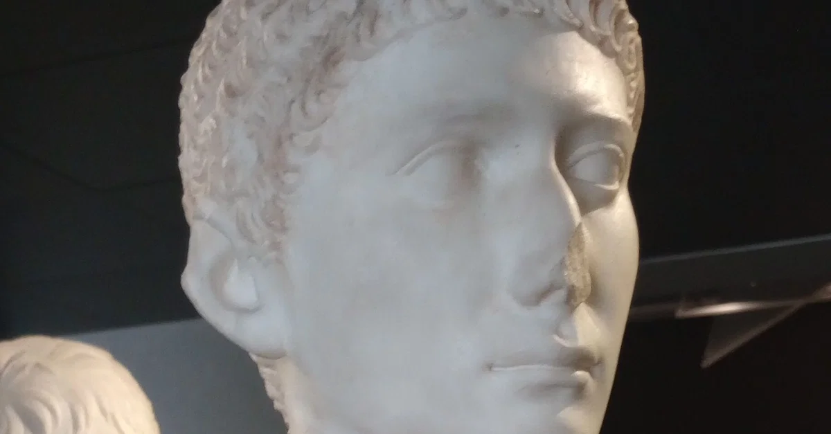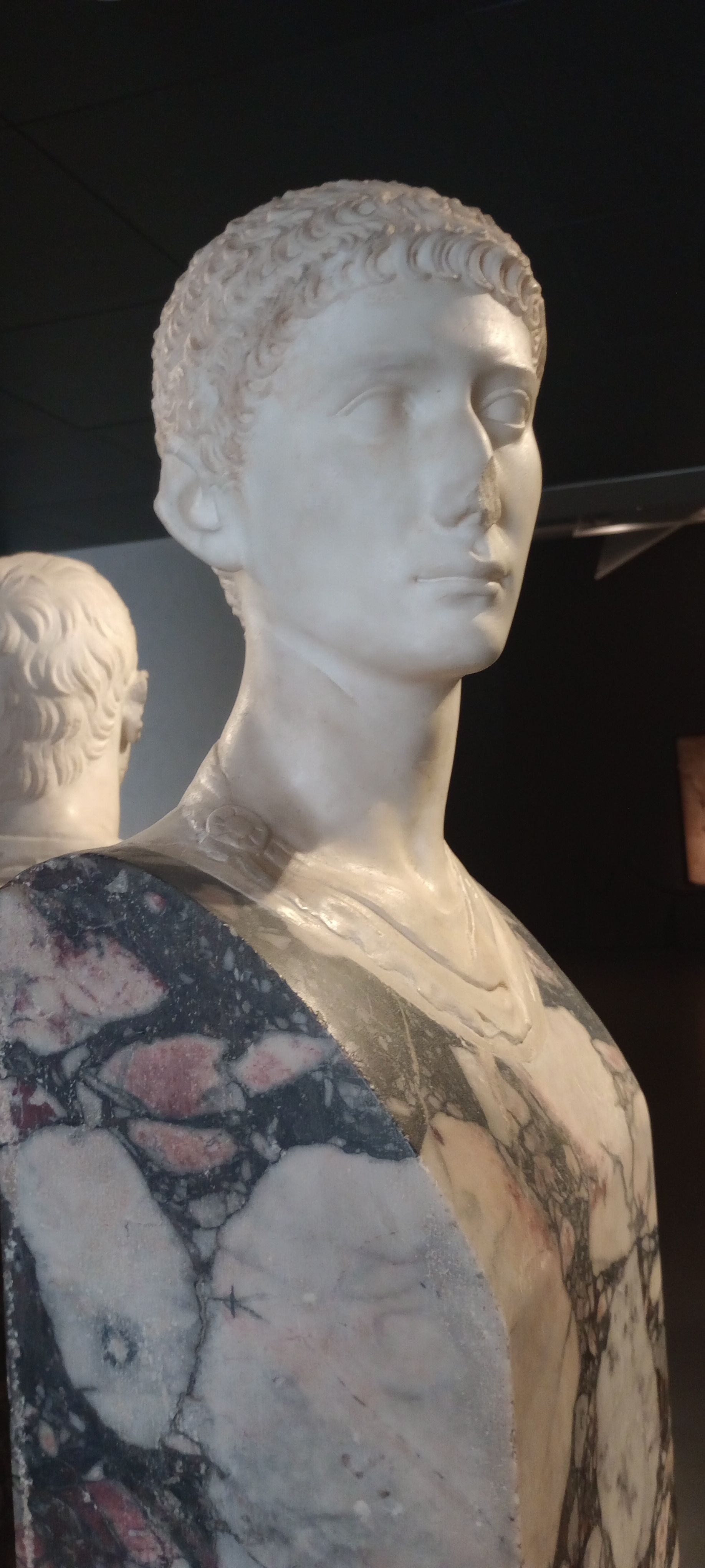 Marble bust is of a young, successful, and wealthy charioteer, part of a group of seven busts discovered in 1889 during the construction of Trastevere train station in Rome; located on the eastern slopes of Monteverde Hill, called Horti Caesari in Roman times.