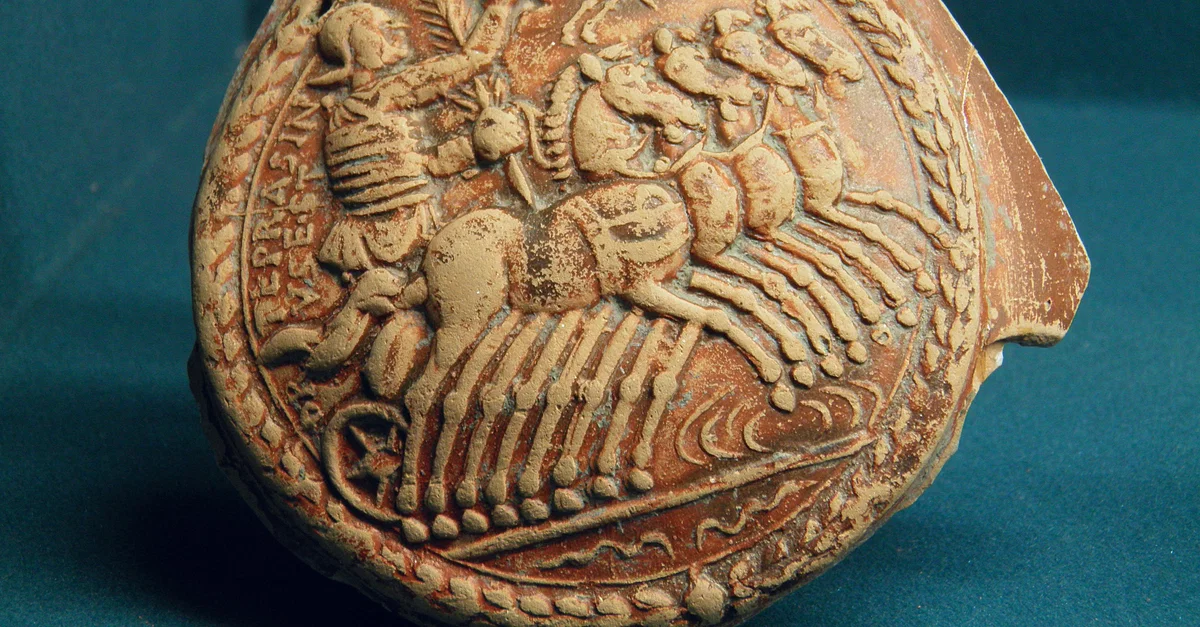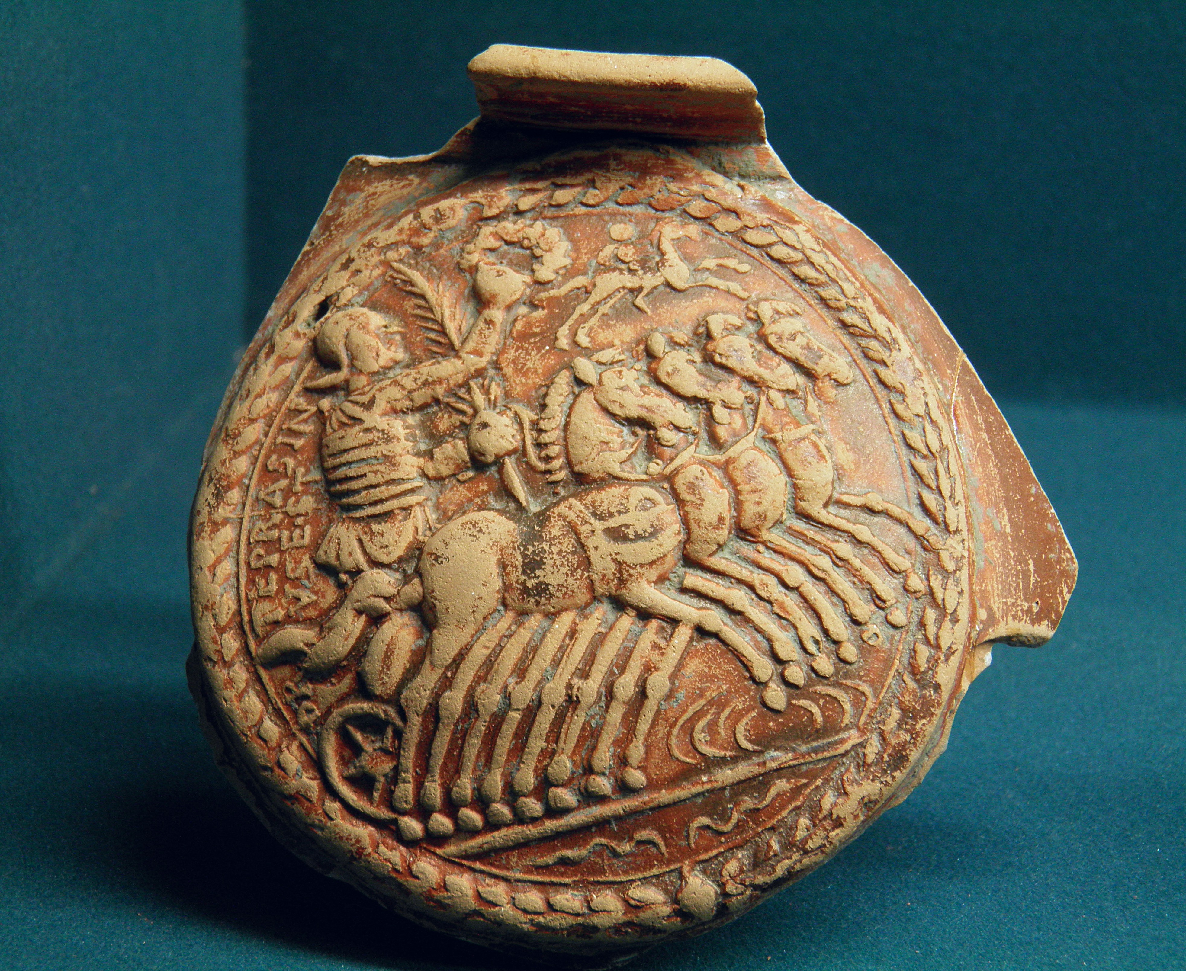 Terracotta medallion depicting a charioteer in his quadriga, holding the victor's crown and palm branch, from the Rhône Valley, dated to the late 2nd or early 3rd century CE.