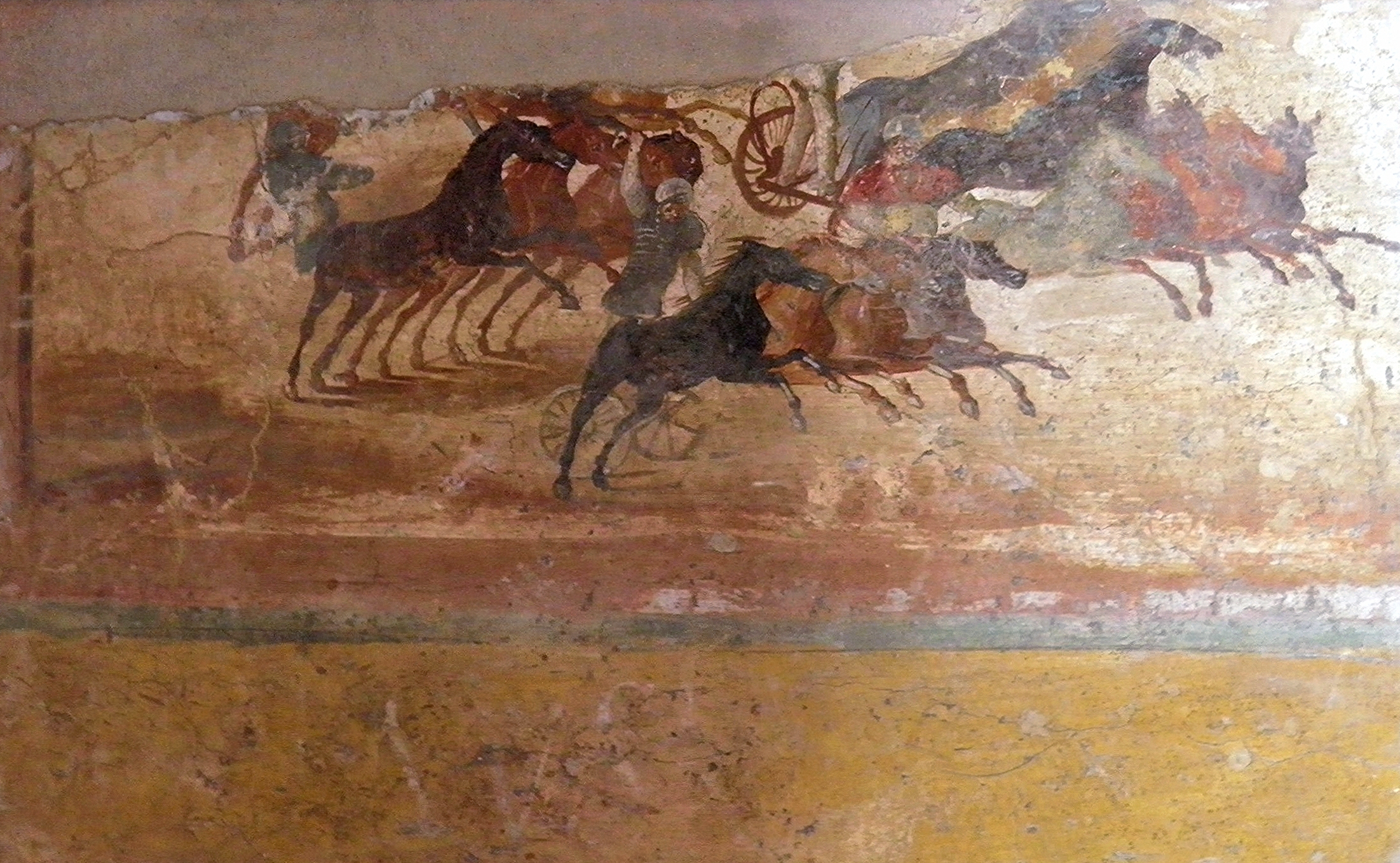 Roman wall painting depicting a chariot race, from Pompeii, Casa delle Quadrighe (House of the Chariot Race), dated to 68-79 CE.