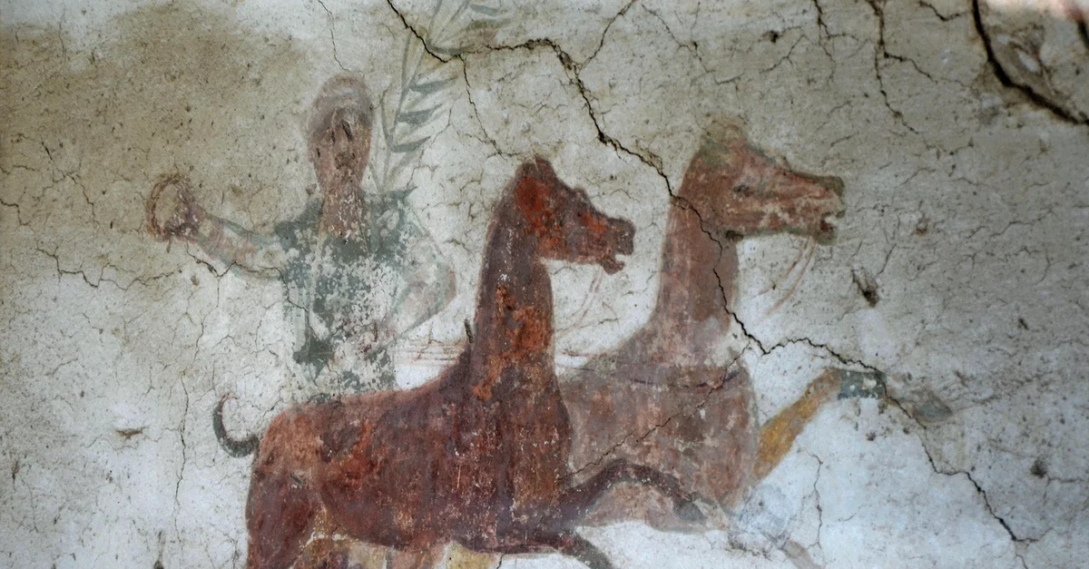 A fresco of a charioteer from the green faction holding a crown and a palm branch, the symbols of victory, from the Antonine period (mid-2nd century CE).