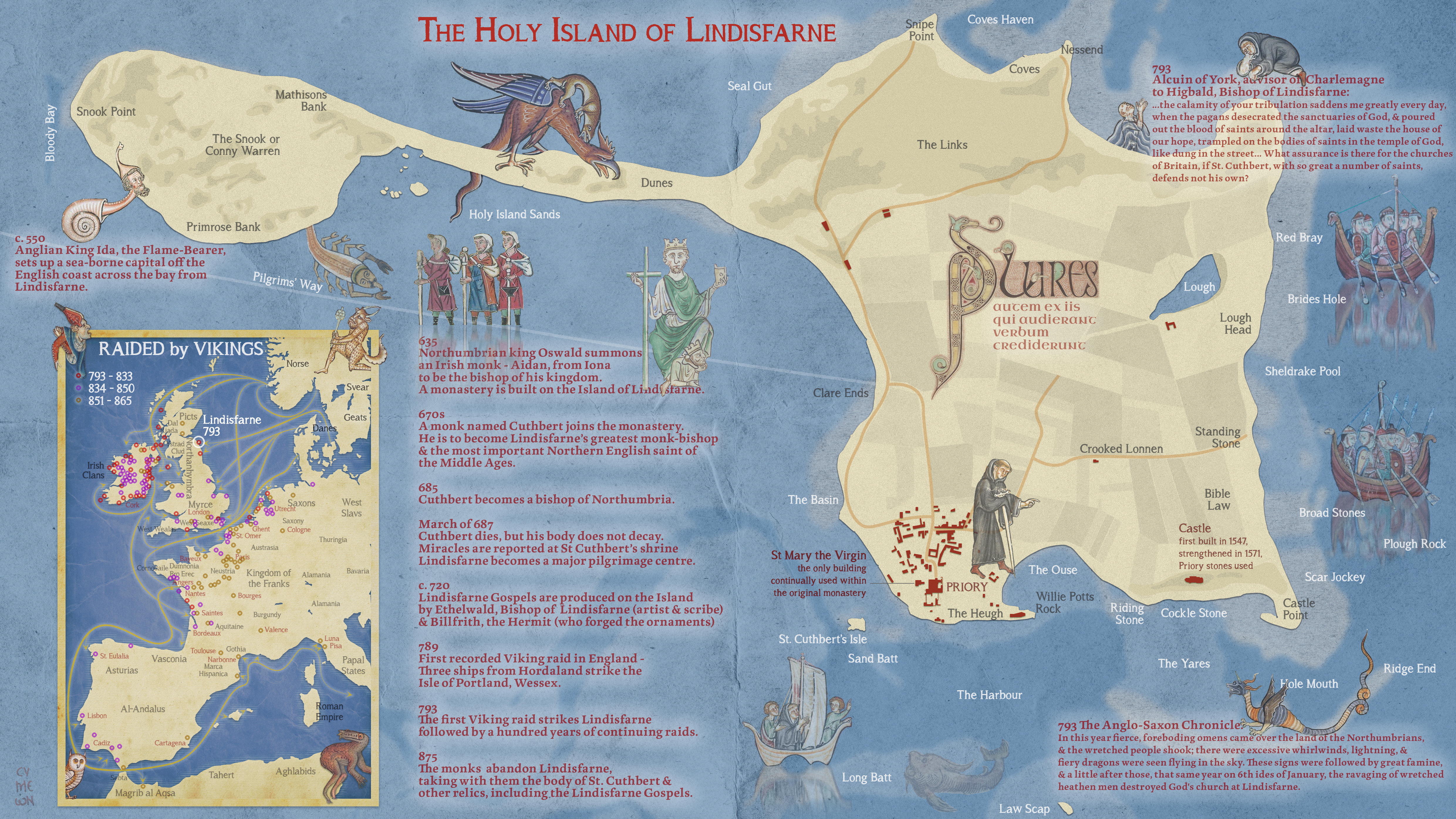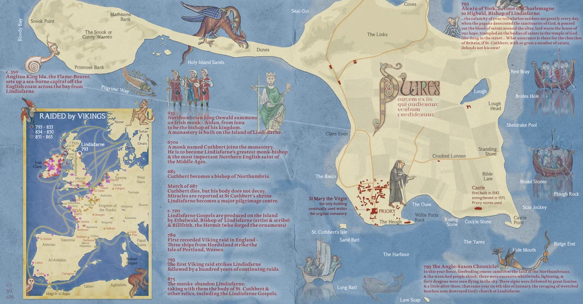 A map illustrating the geography and history of Holy Island, also known as Lindisfarne. A tidal island off the northeast coast of England in Northumberland, it holds significant historical and religious importance due to its early Christian monastery, founded in 635. The island became a center of Christian learning and missionary work in Anglo-Saxon England. Its remote and serene location contributed to its role as a spiritual and scholarly retreat. Saint Cuthbert, one of Lindisfarne’s most venerated figures, served as a monk and later Bishop of Lindisfarne. Around 700, the island monastery produced the Lindisfarne Gospels, an illuminated manuscript celebrated for its intricate Celtic, Anglo-Saxon, and Christian designs.