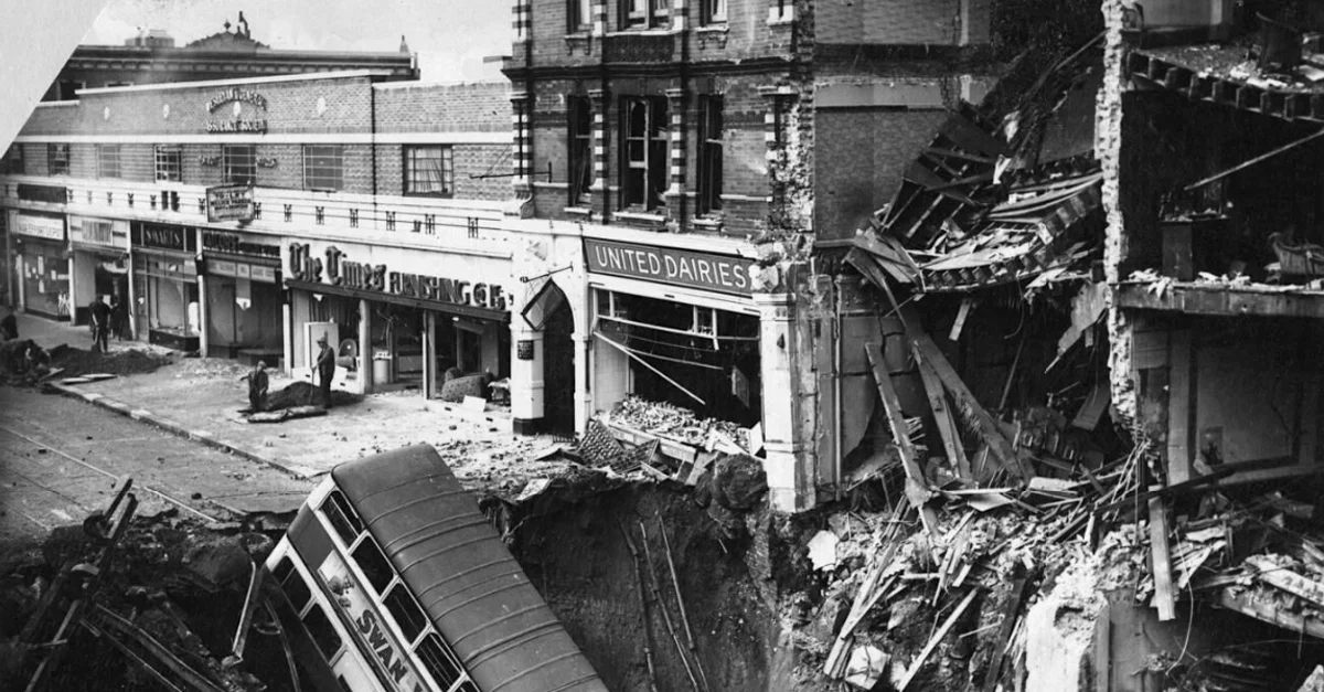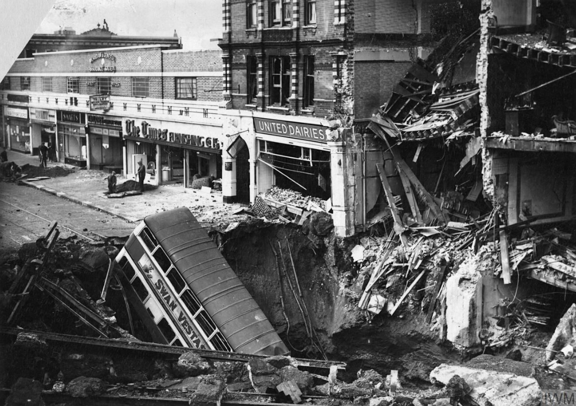 A photograph showing bomb damage in Balham during the London Blitz (1940-1). October 1940. A bomb hit the Balham Underground Station, killing 68 people. The bus then drove into the crater, a frequent consequence of blackout conditions. (Imperial War Museums)