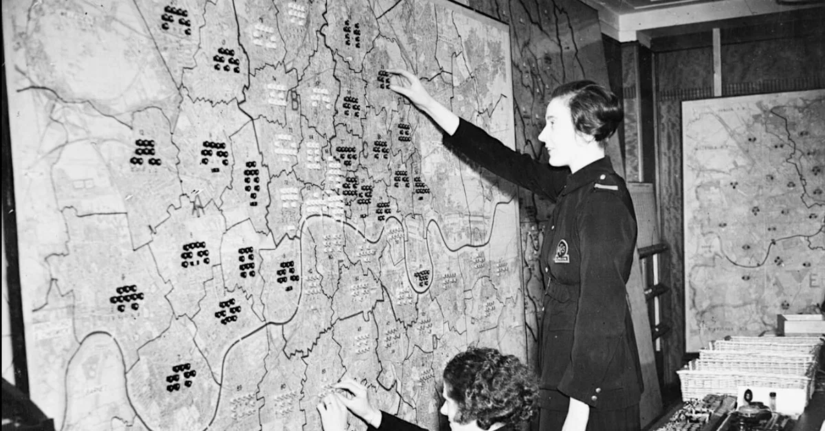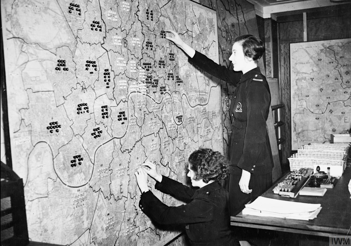 Women volunteers of the Auxiliary Fire Service (AFS) during the London Blitz. They are plotting the distribution of fire engines on a map of London in the regional control centre. (Imperial War Museums)