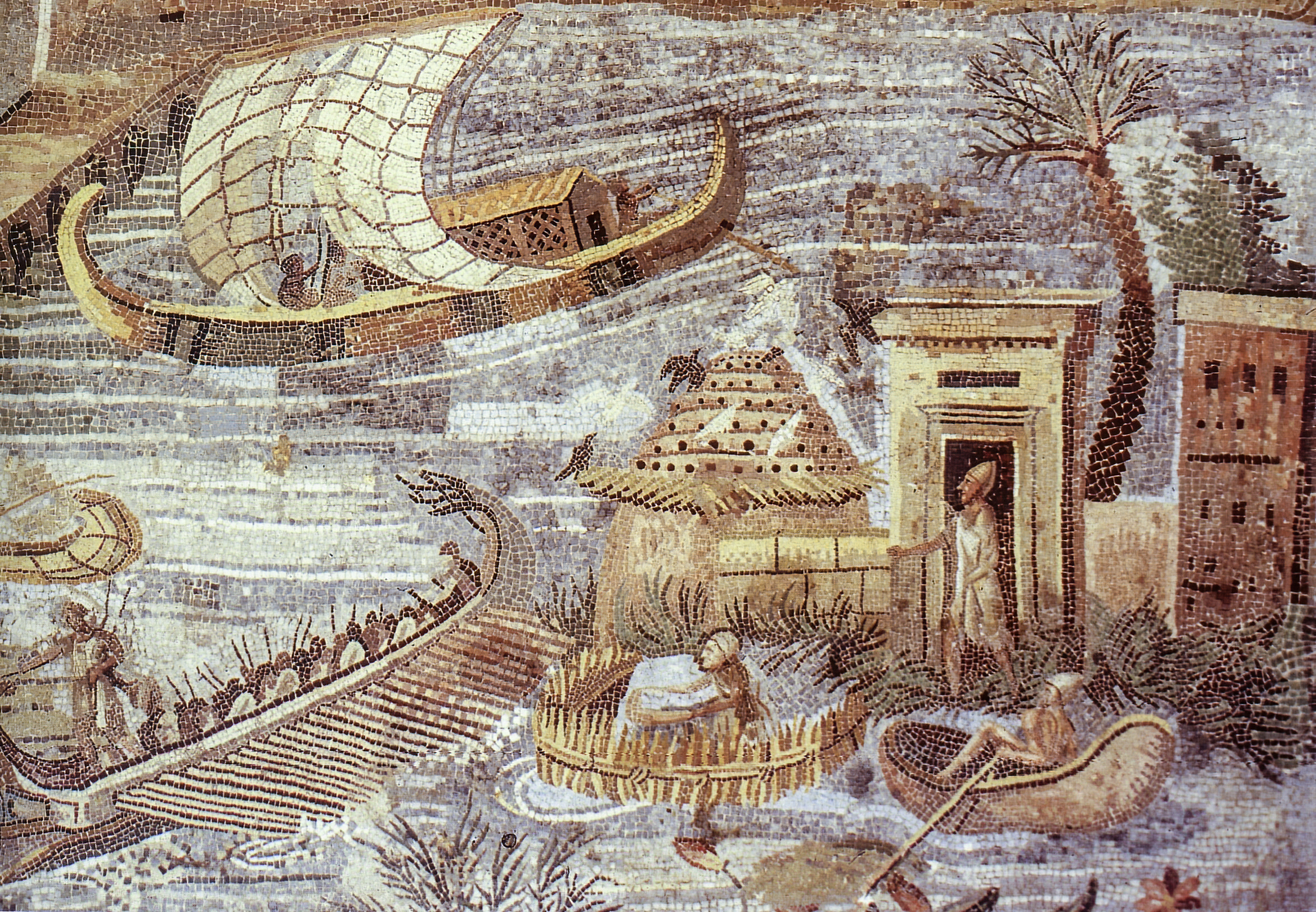 A close-up of the Nile Mosaic (c. 2nd century BCE), depicting Ptolemaic ships with soldiers onboard.