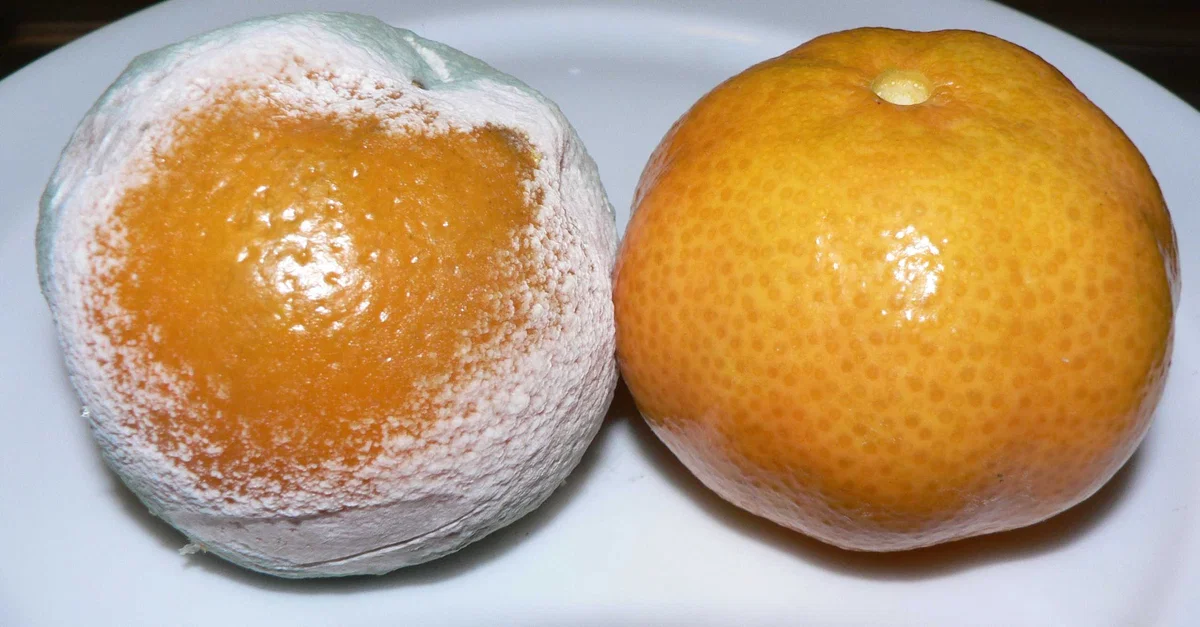 Some penicillium mold on mandarin oranges, probably Penicillium digitatum.