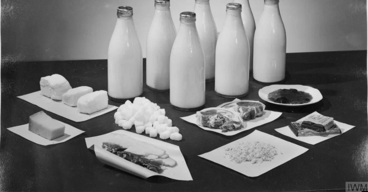 A photograph showing the foodstuffs two adults were entitled to during rationing in wartime Britain. There is milk, sugar, bacon, cheese, butter and chocolate. Other items were also rationed whilst bread, fruit, and vegetables were not. (Imperial War Museums)