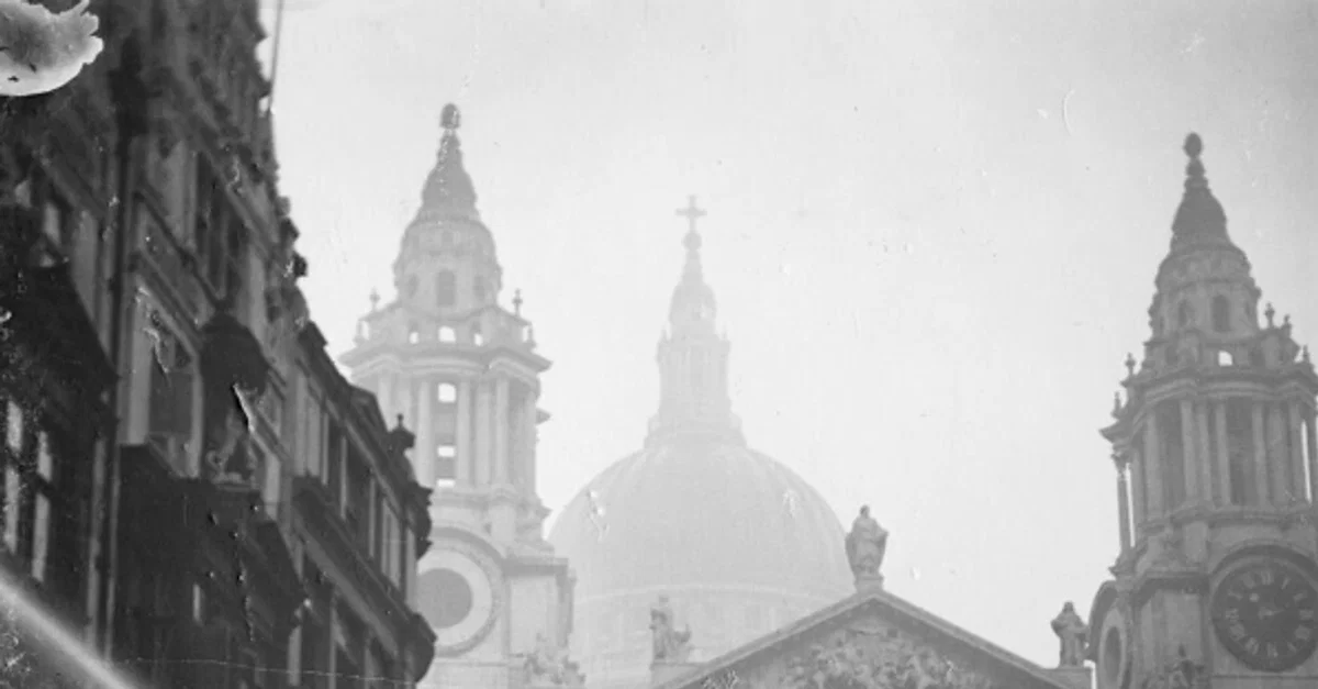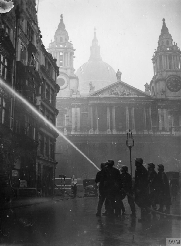 A photograph of firemen fighting a blaze during the London Blitz (1940-1). St. Paul's Cathedral can be seen in the background. (Imperial War Museums)